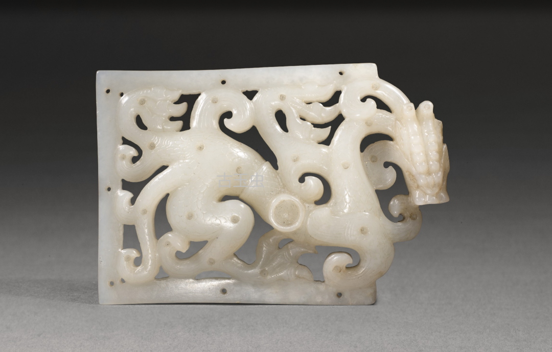 白玉质,扁平体。透雕一龙纹,躯身蟠曲,满饰鳞纹,细尾下卷,四肢(其中一肢断损),各三爪。龙躯上钻有二十余处不透之小孔,原应为镶嵌宝石之用。器边框亦有小孔若干,可能供金属丝与衮带缝缀之用。器背面两侧边各有一行铭文,共计四十六字,内容涉及制作年代、制作机构、器物名称、制作工时、监造官员姓名等,在目前所见玉器中极为罕见,尤其珍贵。