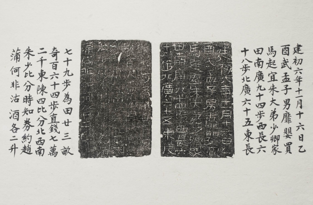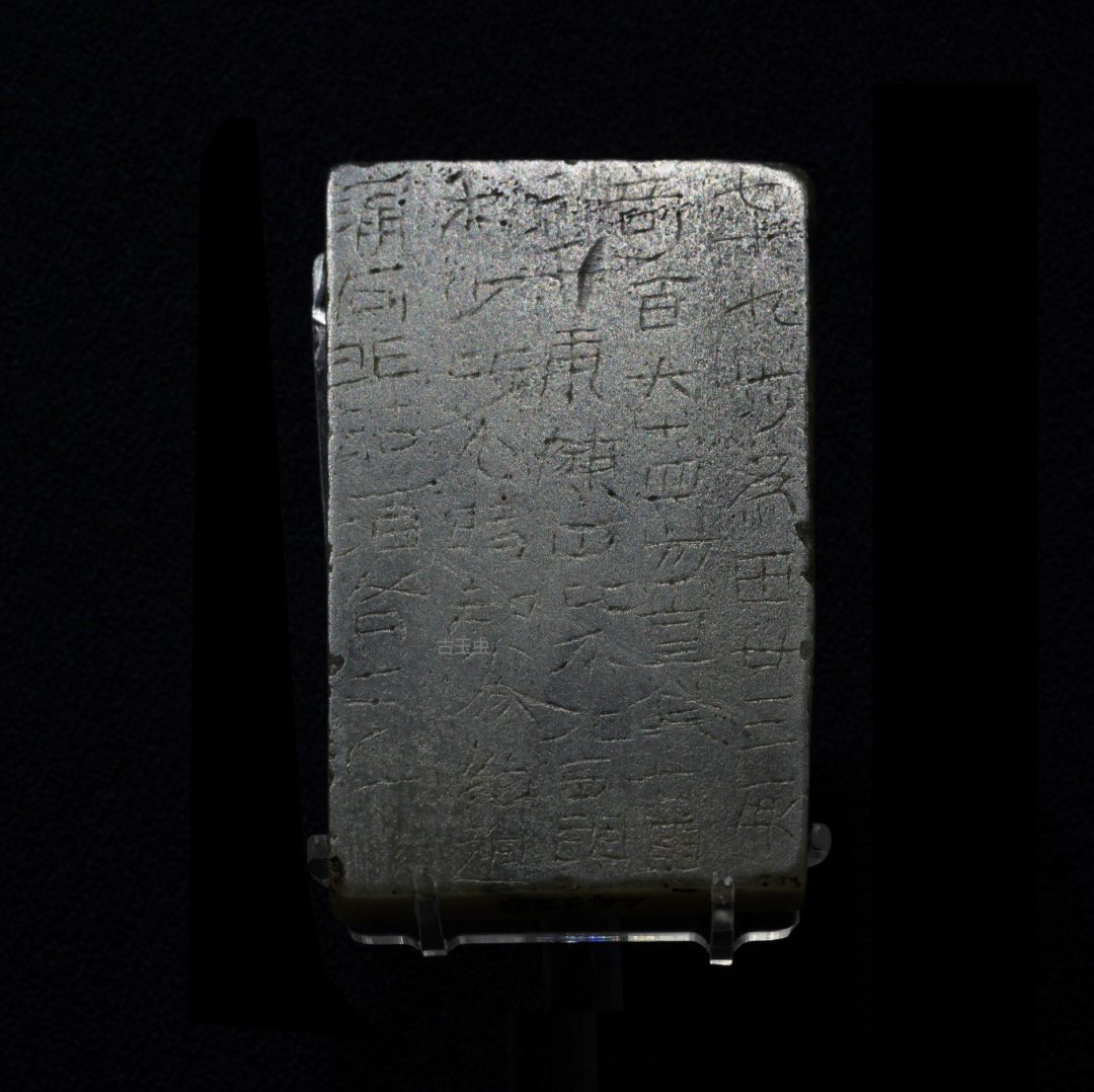 碧玉质,长方体形,无孔,正反两面均有阴刻隶书铭文。大意为公元81年靡婴购得这块墓地,并注明东南西北四至面积及见证人。此件地券传出自山西忻州,是迄今发现的唯一一件玉质买地券,也是已知东汉买地券中年代最早的。