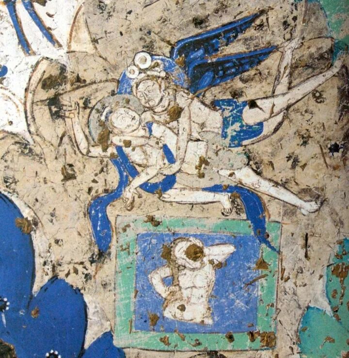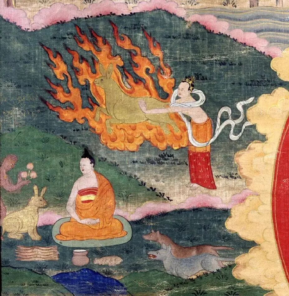 经过长期的加工、改编,佛教徒又把这些佛本生故事编集成《六度经》《贤愚经》《菩萨本缘经》《佛本生经》《佛报恩经》等。实际上这些本生故事经是一部部古印度和东南亚的神话、童话、民间故事集。壁画中的本生故事,就是依据这些佛教经典绘制的。猴王舍身救群猴本生 克孜尔石窟38窟主室券顶左侧 图源:旃檀精舍一般来说,这种题材在各类佛教壁画中是最常见,也最复杂的。因为本生图本身内容通俗易懂,且道理深刻,对佛教的传播具有极好的作用,所以在壁画中,本生图的内容特别多,而且多有重复。其中最为常见的,是兔本生(投火的兔子)、萨埵太子本生(舍身饲虎)等。