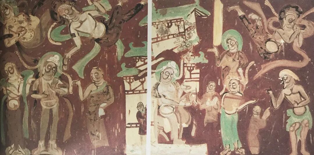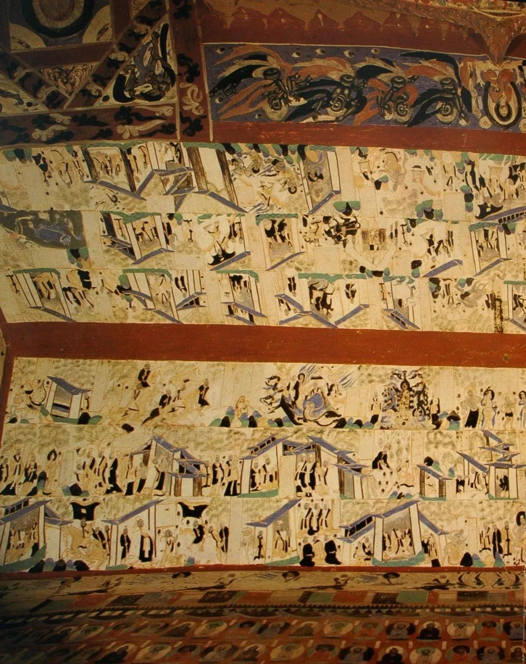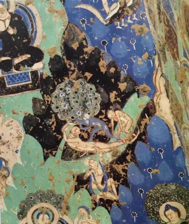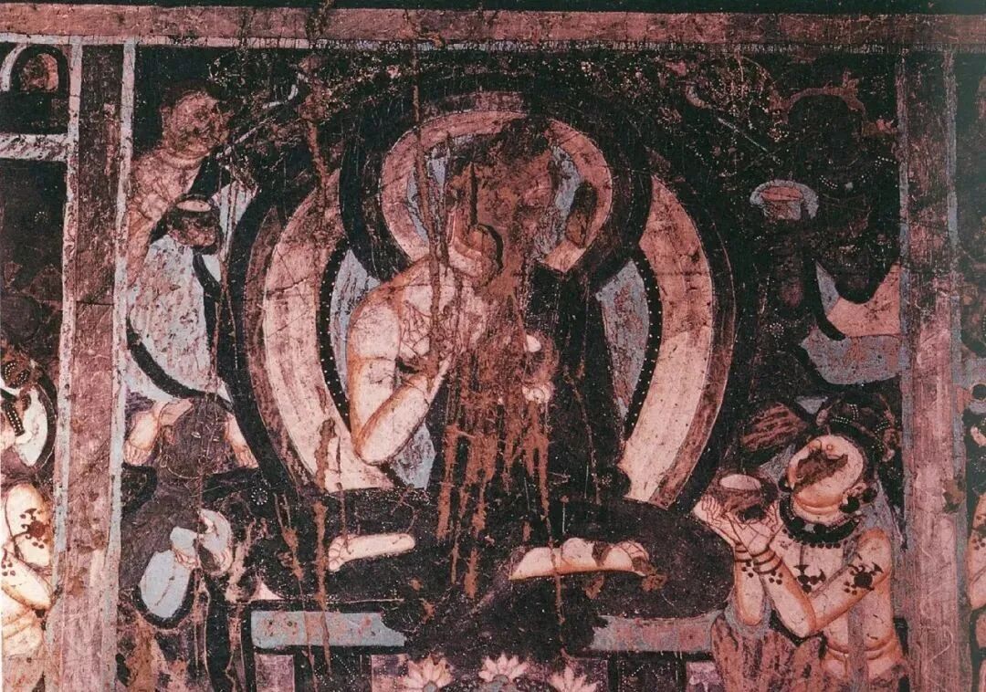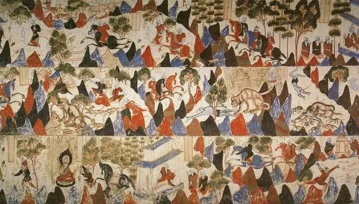 壁画中完整的佛传故事画不多,大量的佛传故事画是以佛传故事的主要情节绘制的。把释迦牟尼生平的每一主要情节称为一相,因而故事画有四相、八相、十二相乃至更多的画法。不过,出于故事的完整性,佛传故事最为常见的组成,应该是由下凡、入胎、出胎、出家、降魔、涅槃等佛祖的八个事迹组成的“八相图”。敦煌莫高窟290窟莫高窟壁画中最完整的连环画式佛传故事画图源:云书敦煌而在大型壁画中,佛传故事画大多选取一两个有代表性的情节来表现,如释迦诞生前摩耶夫人梦见白象的场面,称作“乘象入胎”。悉达多太子决定离家修行而骑马逾城的场面,称为“逾城出家”。这两个情节,一个象征着释迦的诞生,一个象征着释迦牟尼修行的开始,是壁画中最为常见的佛传场面。![]()