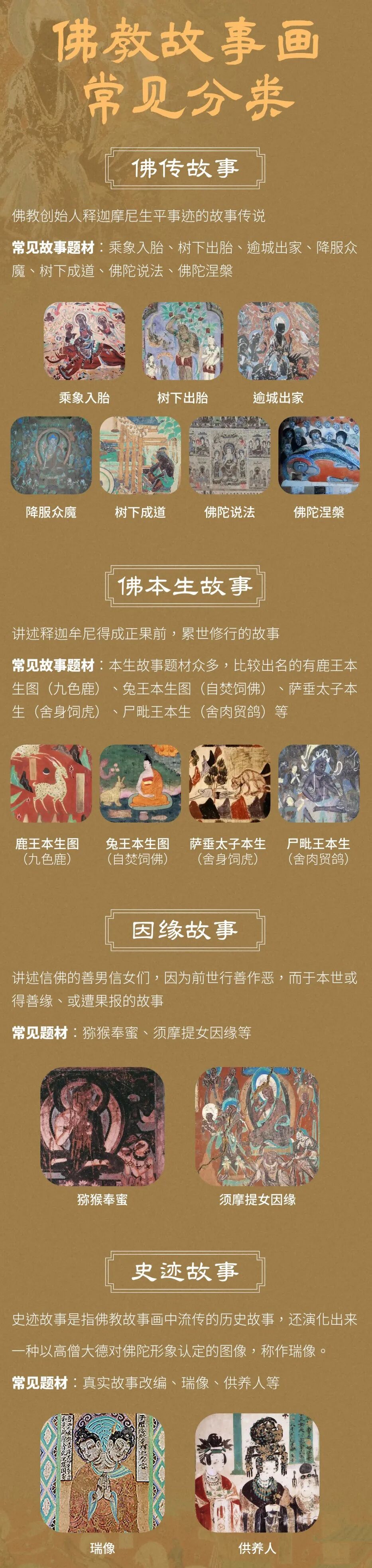 在佛教的发源地古印度,各种教派都曾在这里发展,其中有在思想领域占统治地位的宗教,也有远比佛教主张先进的派别。但是,它们只囿于一时、一地,即使曾经辉煌过,也逃不过各类倾轧的拖累。最终,只有佛教发展成为世界性的大宗教。这在很大程度上得益于佛教对故事的诠释。佛教为了宣扬其教理,往往用一些浅显的故事来解很多深奥的道理;同时,为了强化释迦牟尼这一崇拜对象在信徒中至高无上的地位,就十分重视对佛教创始人释迦牟尼的宣传。莫高窟320窟宫殿中的思维菩萨 佛陀前身 图源:莫高窟官微这些语言通俗朴素、情节生动活泼的故事口口相传,多方比喻,因事立说,使佛教获得了越来越多的信仰者。哪怕是之后,佛教往全世界扩张、发展的时候,这些包含着一定哲理的故事,也为佛教的发展打下了重要的基础。无论是画作,还是雕塑,都是依据佛经绘制的。而佛经卷帙浩繁,有成百上千的各类故事,题材十分丰富,我们要怎么分辨呢?我们依据佛经故事的内容性质,将这些故事大致归纳为以下几种类型并略作总结,以方便大家探索。当然,除了这几种故事形式,还有一种在壁画中经常出现的题材——经变故事。所谓经变,就是以图像的形式来说明某部佛经的思想内容。由于它不属于纯粹的佛教故事,因此本次总结未将这一类型列入其中。佛传故事,顾名思义,就是佛教创始人释迦摩尼生平事迹的故事传说。![]()