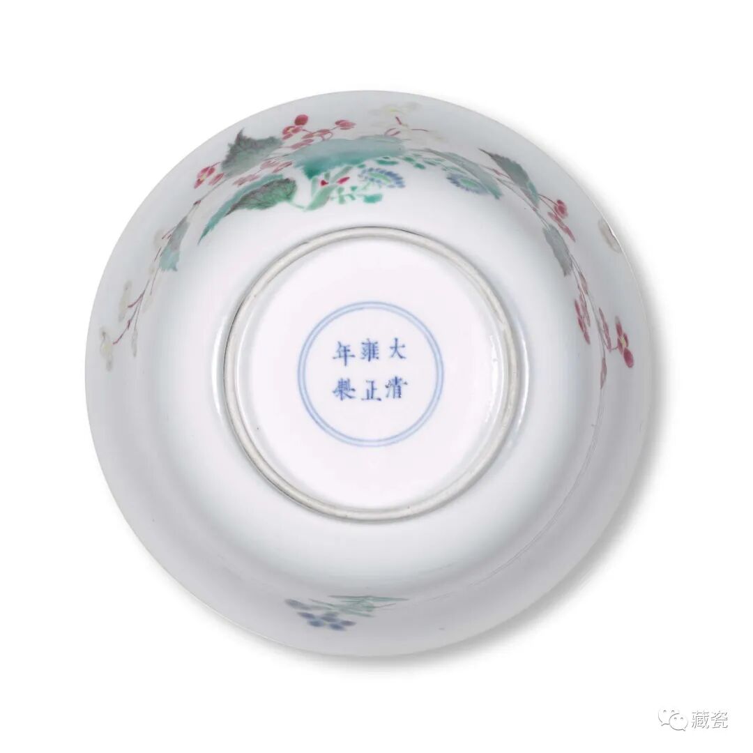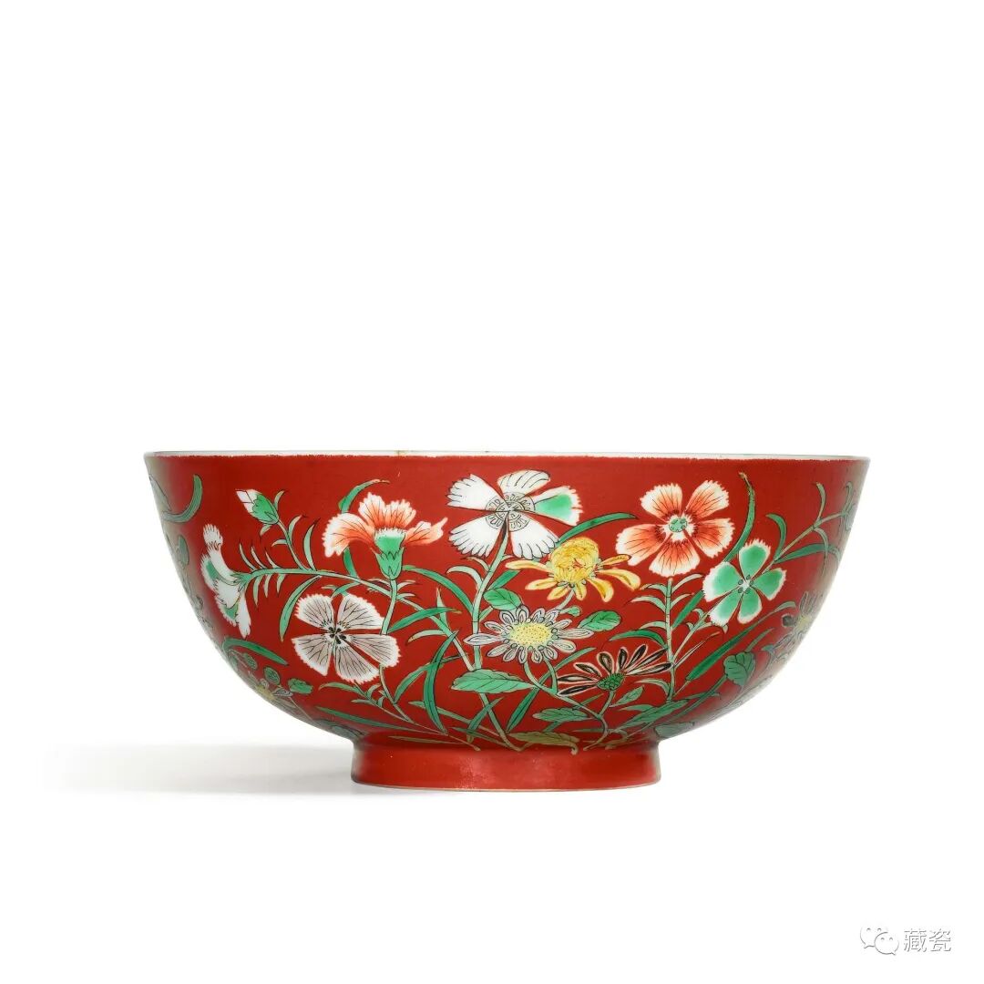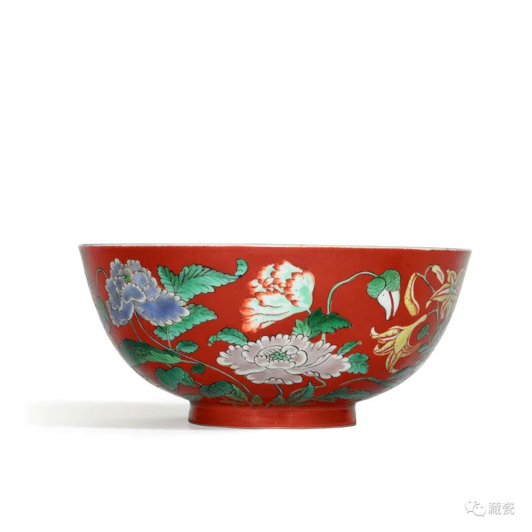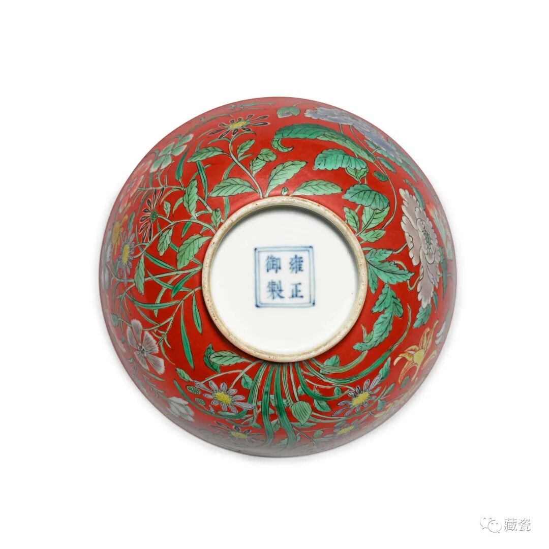 Lot11清雍正珊瑚红地五彩九秋同庆纹碗
