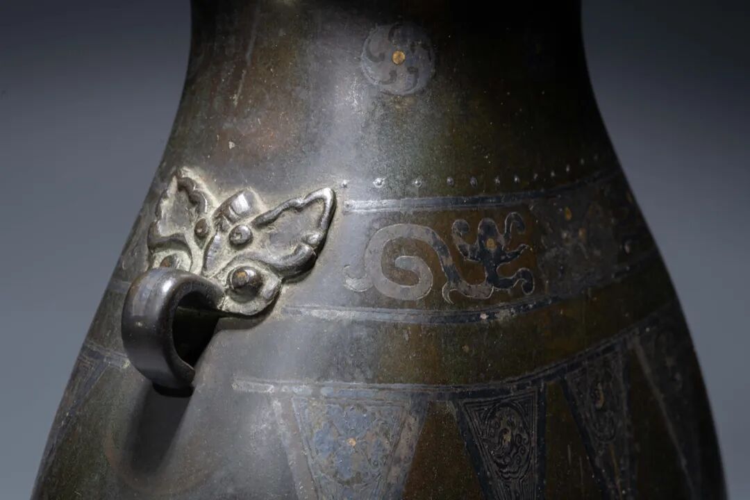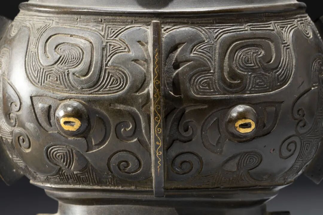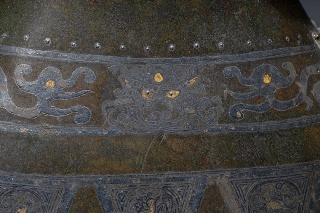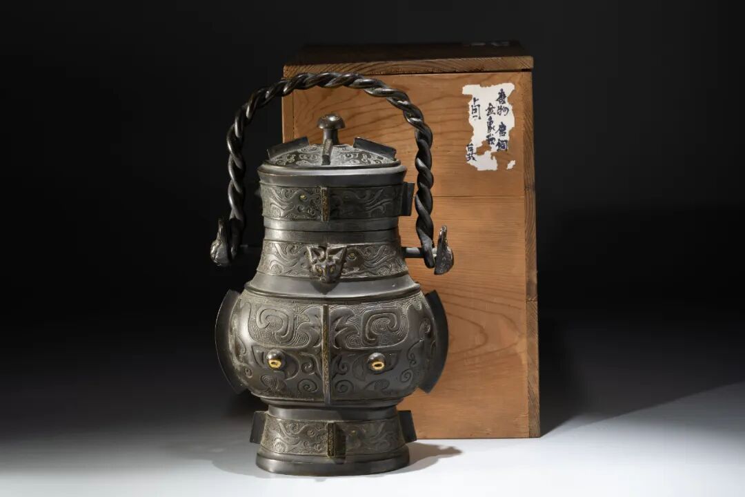 此器仿自三代青铜器中的卣,从《博古图录》中可考。此卣器体厚重,隆盖,绳形提梁。口微外撇,颈稍收,腹壁圆曲,垂腹明显,圈足底部外撇作高阶状。器盖子母口,盖中央设圆钮,钮面四等分,分饰错银金变形蝉纹,盖内刻有铭文。颈两侧设置活络提梁,表面满饰云雷纹锦地错金银夔龙纹,提梁两端作牺首形。颈前后亦饰对称兽首一对。盖面、腹部为错金银兽面纹,兽面圆睁双目,气势威严。盖侧边、器颈、足部饰错金银长卷尾鸟纹,冠羽作歧冠式下后垂,仰首尖喙,尾羽翻卷纤长,器宇轩昂。纹饰均以隐起云雷纹作地。盖、腹、足皆有出戟。纹饰以错金银而成,线条流畅自然,技巧高超精湛,错金明丽,错银古朴,铜质敦厚典雅,精美华贵,颇为少见。错金银工艺兴盛于春秋中晚期,工艺要求复杂精细,此器金银丝线镶嵌完美,填划曲线自然生动,磋磨光滑平润,实属难得精品。卣为青铜盛酒器,此提梁卣造型仿制规矩,做工考究,深得上古遗风,加以明代高超的制作技术,魅力非凡。