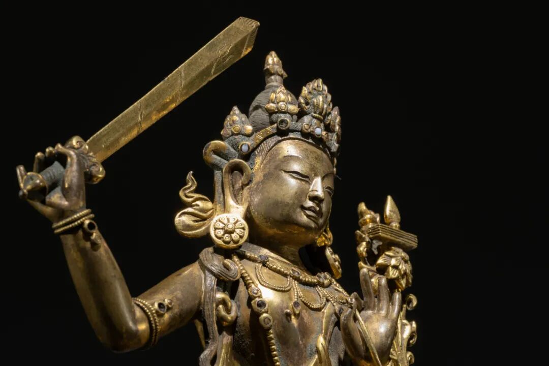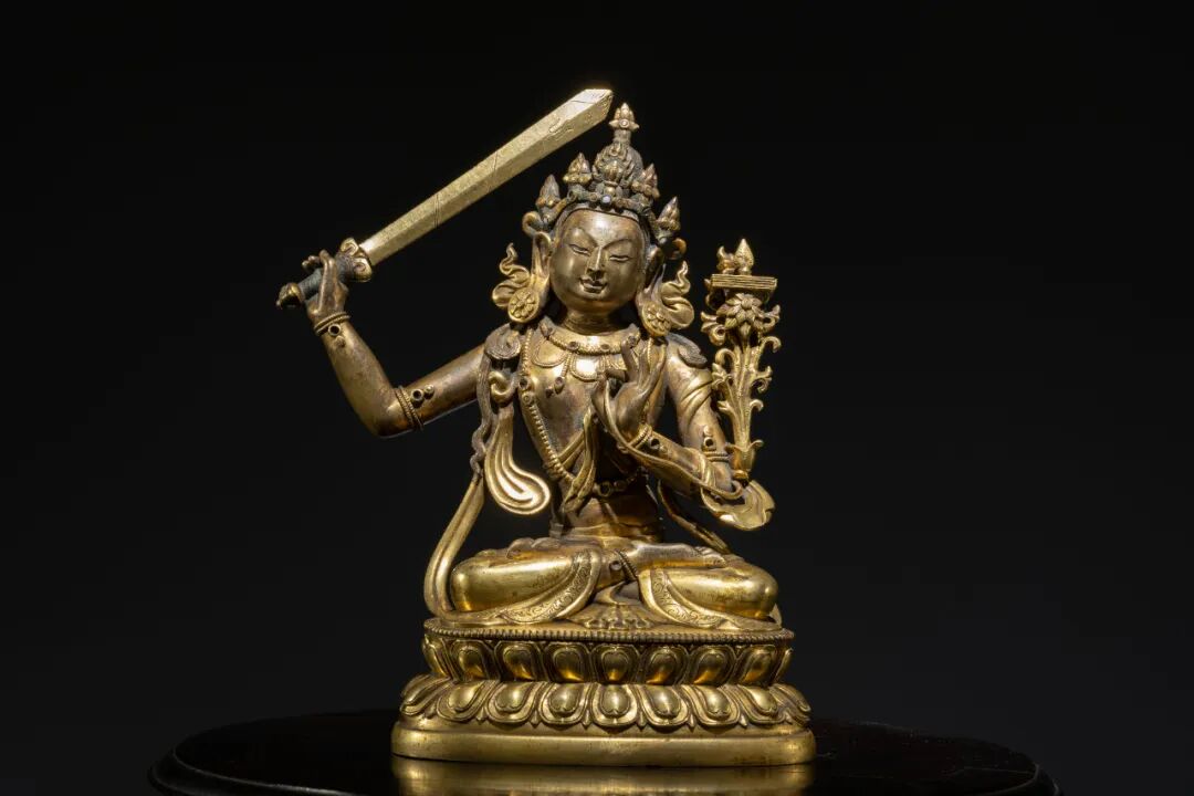 本尊文殊菩萨为清乾隆北京风格造像,头戴五叶花冠,顶结高髪髻,面容圆润饱满,双眉细长,双目低重,鼻梁平直笔挺,唇线清晰,法相森严。整体比例结构精准,宽肩窄腰,躯体柔软,肌肉饱满有力,体态婀娜,富有动感之美。上身袒露,仅披帔帛,以项圈及长链为装饰,项圈下缀连珠式璎珞;手和足部有钏躅装饰。右手高擎宝剑,横断上空,能斩断一切烦恼与愚痴;左手当胸前结说法印,左臂缠绕莲花于肩头绽放,莲花托般若波罗蜜多梵匣,代表般若智慧浩瀚如经卷。下身着长裙,衣褶散落于座面,衣纹流畅优美。结跏端坐于双层束腰式莲花宝座上,上边缘饰一周圆形连珠纹,束腰深陷,莲瓣饱满,立体挺拔。胎体厚重,铜质精炼,嵌饰豪华,鎏金富丽。