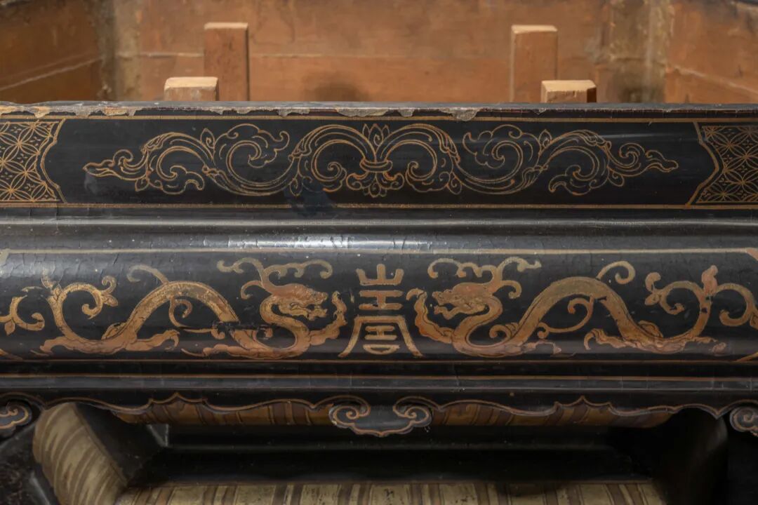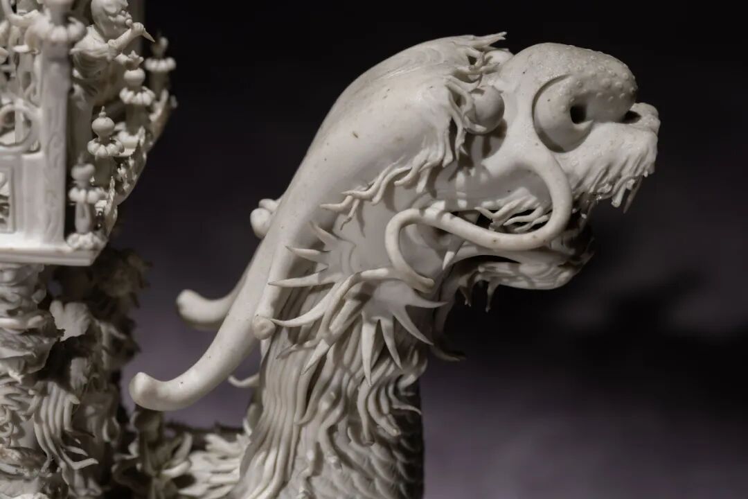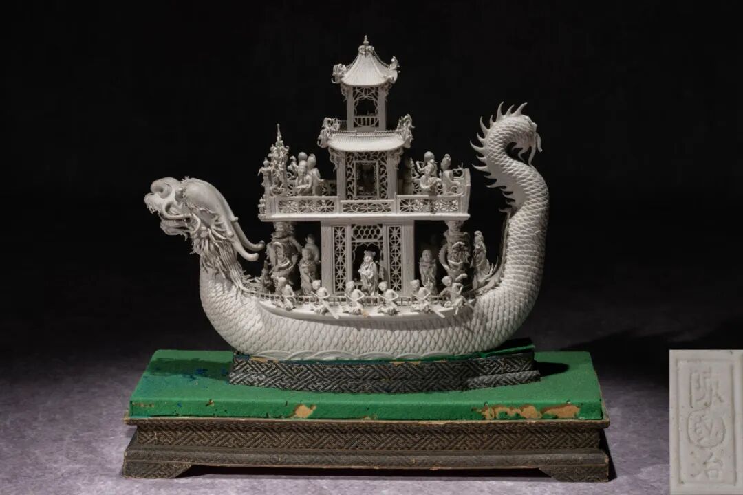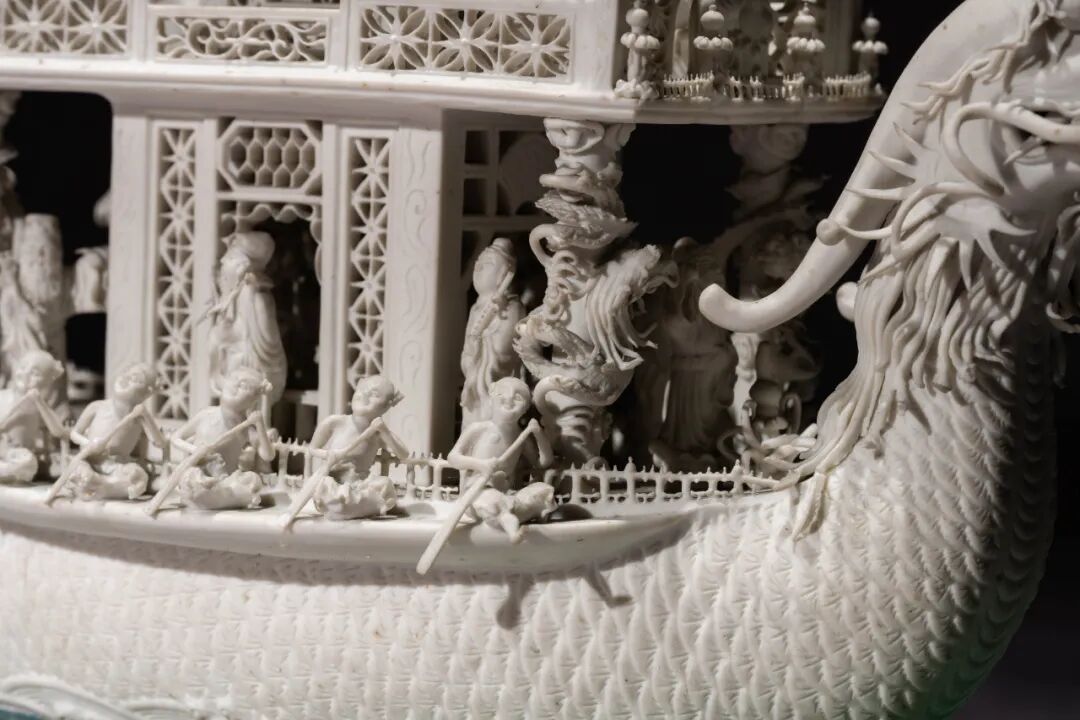 此件生瓷龙舟,胎土淘炼精细,胎质细密,如骨似玉,抚之滑腻。船体作龙身状,首尾上翘,龙首张口怒目,矫健威武,气势昂扬,龙身鳞甲片片毕现。龙舟上镂空雕刻亭台楼阁,檐牙高啄,雕栏画栋,楼中桌椅、杯盏俱全。龙舟上捏塑数人,神态各异,或高谈阔论,或观赏风景,或悠然而坐,或举杯对酌。八仙各持法器,神态各异,龙舟两侧各有六名舟子正奋力划船,人物刻画极为生动传神。此件龙舟构思巧异、工艺非凡,细部处理极为细腻。