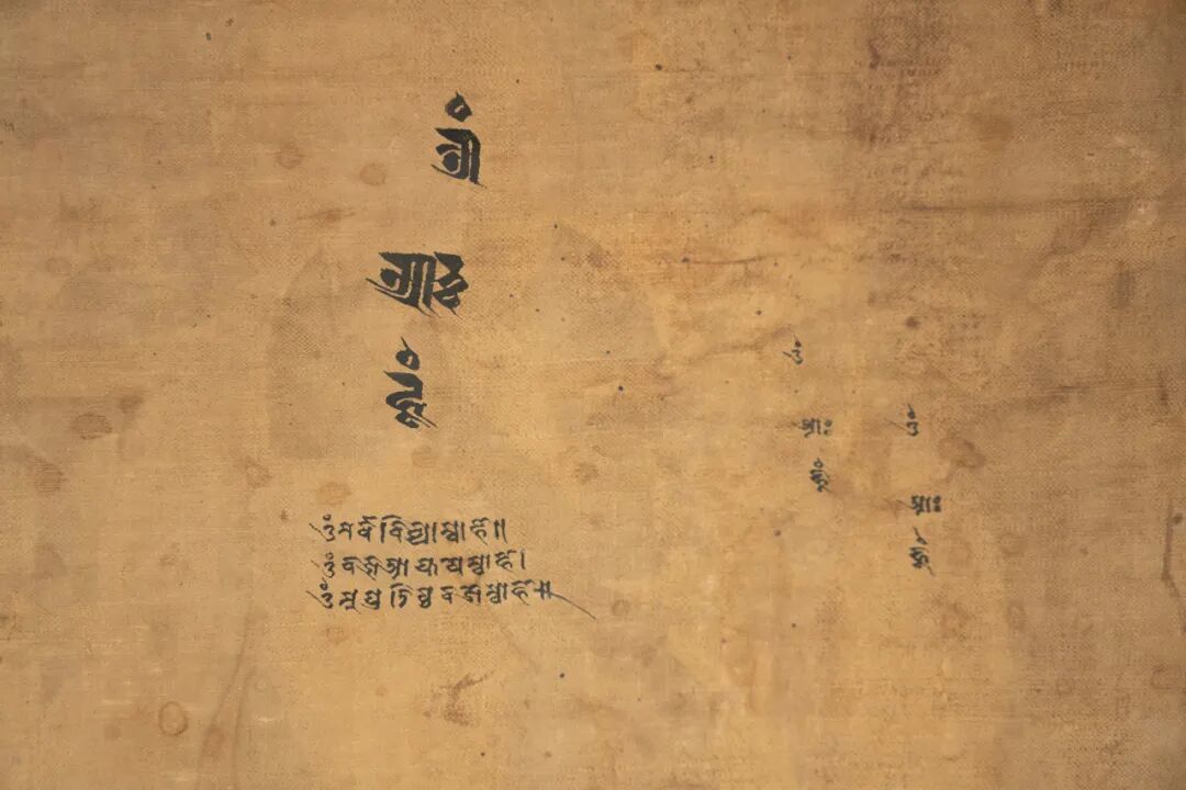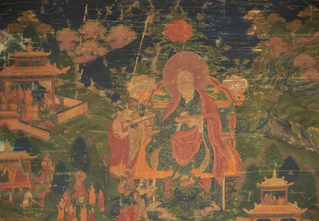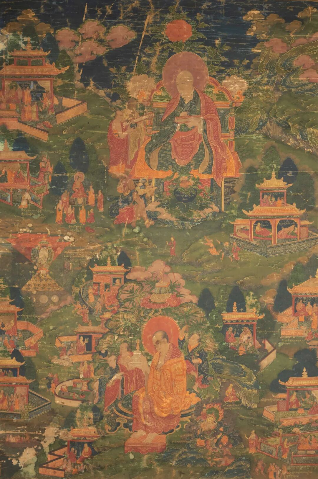 此唐卡以浮云、连绵的山脉以及宫殿等景物将画面分为若干情节,讲述戒博迦尊者于阿密特尊者的生平事迹。画面上方双手捧经书坐在瀛台上与众弟子说法论经者为戒博迦尊者,画面下方是十六尊者中最易辨认的阿秘特尊者,他手托菩提宝塔于胸前。阿密特尊者身旁则为四大天王中的北方多闻天王。整幅唐卡描绘,祥云,群山,寺庙,宫殿等。画师对人和动物的外貌、性情、服饰、器具,以及水势、山石、花木等都悉心描绘,将他们有机和谐地组合在一起。这种极富透视感的画面与丰富的色彩令人产生无限遐想。其深于刻画、构思巧妙,画面生动自然、情态多具,造就了悠远典雅、气度恢宏的视觉效果。这种表现手法既来自于佛教思想,也受到汉地绘画的影响,更属于藏民族的文化心理,是唐卡艺术创作的独特需要,堪称佛教思想和艺术的完美结合。