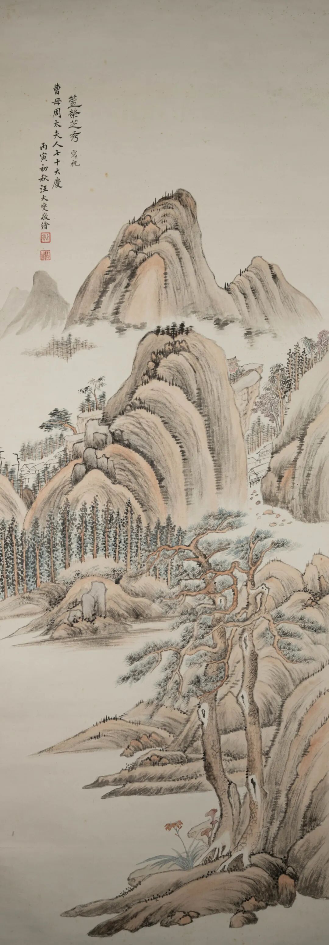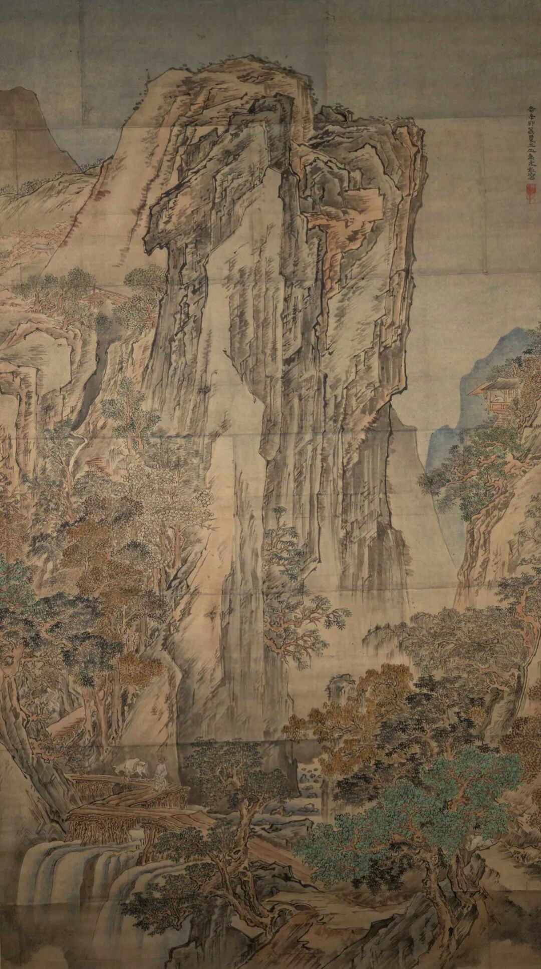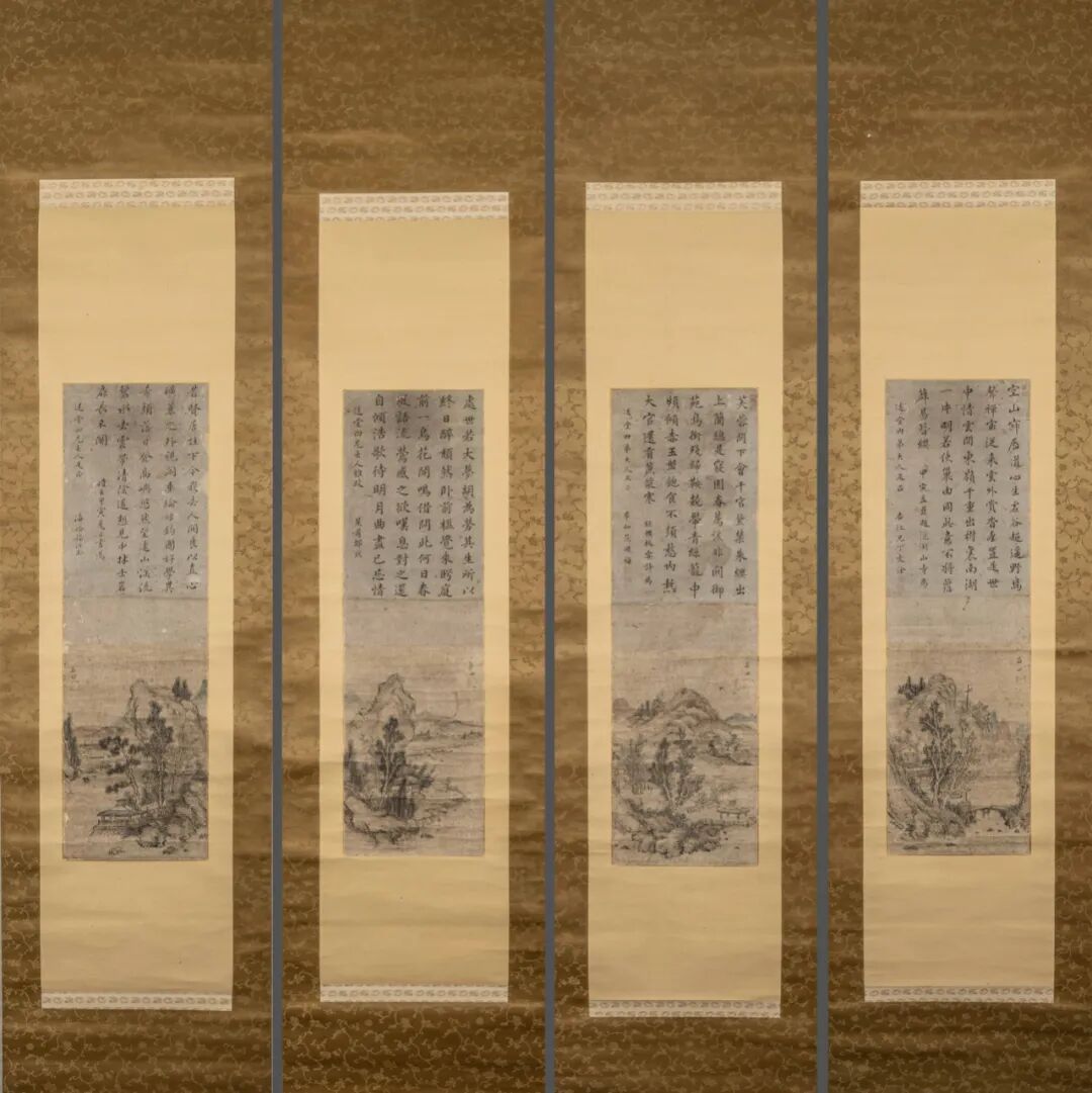此唐卡以浮云、连绵的山脉以及宫殿等景物将画面分为若干情节,讲述戒博迦尊者于阿密特尊者的生平事迹。画面上方双手捧经书坐在瀛台上与众弟子说法论经者为戒博迦尊者,画面下方是十六尊者中最易辨认的阿秘特尊者,他手托菩提宝塔于胸前。阿密特尊者身旁则为四大天王中的北方多闻天王。整幅唐卡描绘,祥云,群山,寺庙,宫殿等。画师对人和动物的外貌、性情、服饰、器具,以及水势、山石、花木等都悉心描绘,将他们有机和谐地组合在一起。这种极富透视感的画面与丰富的色彩令人产生无限遐想。其深于刻画、构思巧妙,画面生动自然、情态多具,造就了悠远典雅、气度恢宏的视觉效果。这种表现手法既来自于佛教思想,也受到汉地绘画的影响,更属于藏民族的文化心理,是唐卡艺术创作的独特需要,堪称佛教思想和艺术的完美结合。