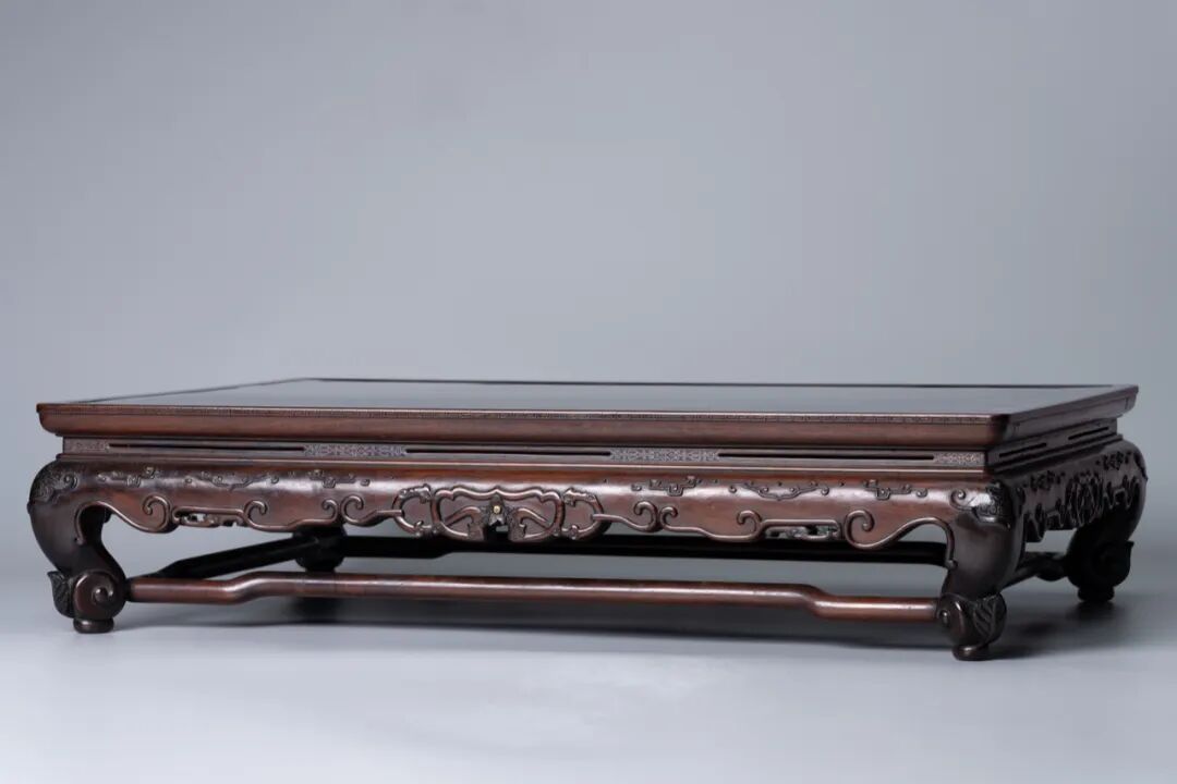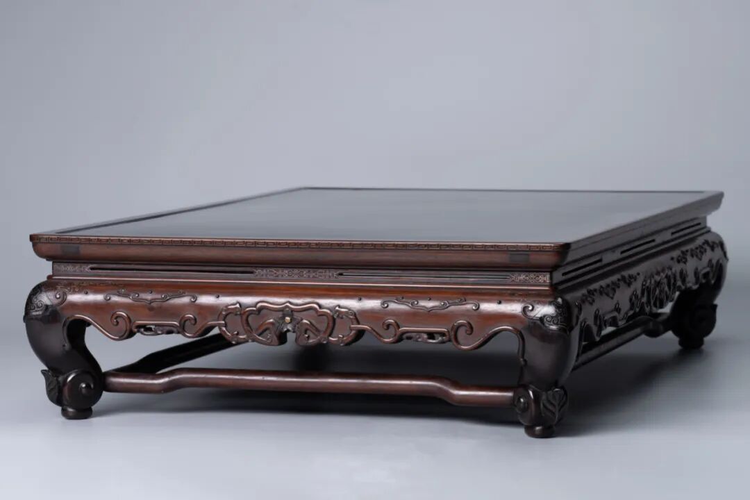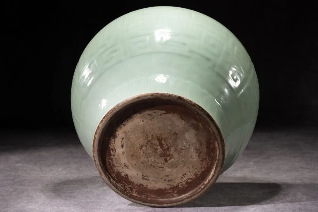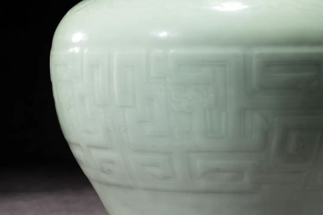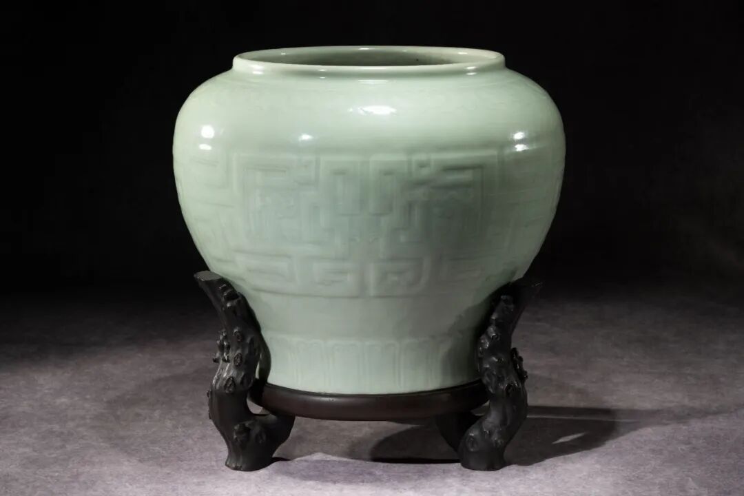 此大罐直口,圆腹渐收,平底,矮圈足,底部露火石红胎,发色纯正。整体施豆青釉,柔和淡雅,肥厚莹润,光洁素雅,质感甚佳,有如青玉一样的艺术效果。腹部浅雕拐子龙纹修饰,庄重大气。拐子龙纹由龙纹变体而来,取龙的富贵,卷草纹的连绵不断之意,寓意富贵永远,子孙延绵不断。这种纹饰在清乾隆时期特别流行。整体造型稳重大方,浑厚淳朴而又不失秀媚,器型规整,比例匀称,令人爱不释手。原配红木材质梅枝三足器台,更是锦上添花。此大罐,为清乾隆时期典型器物。保存至今,殊为难得,当为爱者所宝,藏家所重。