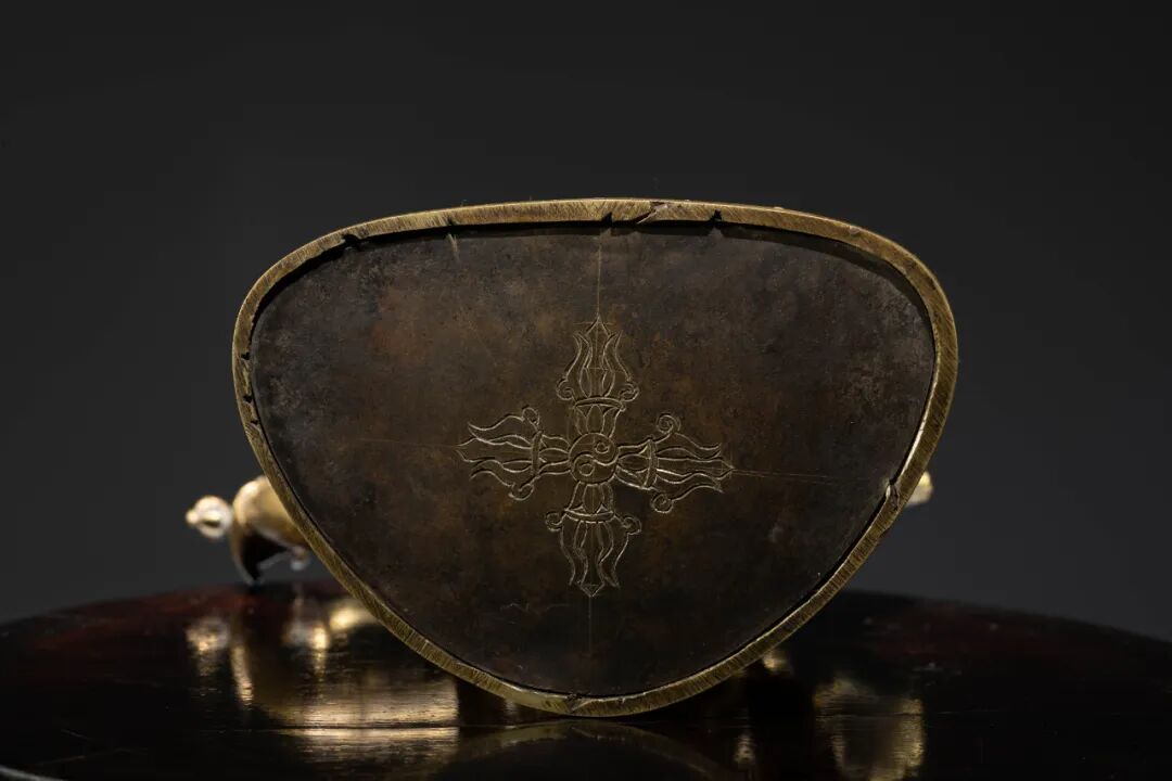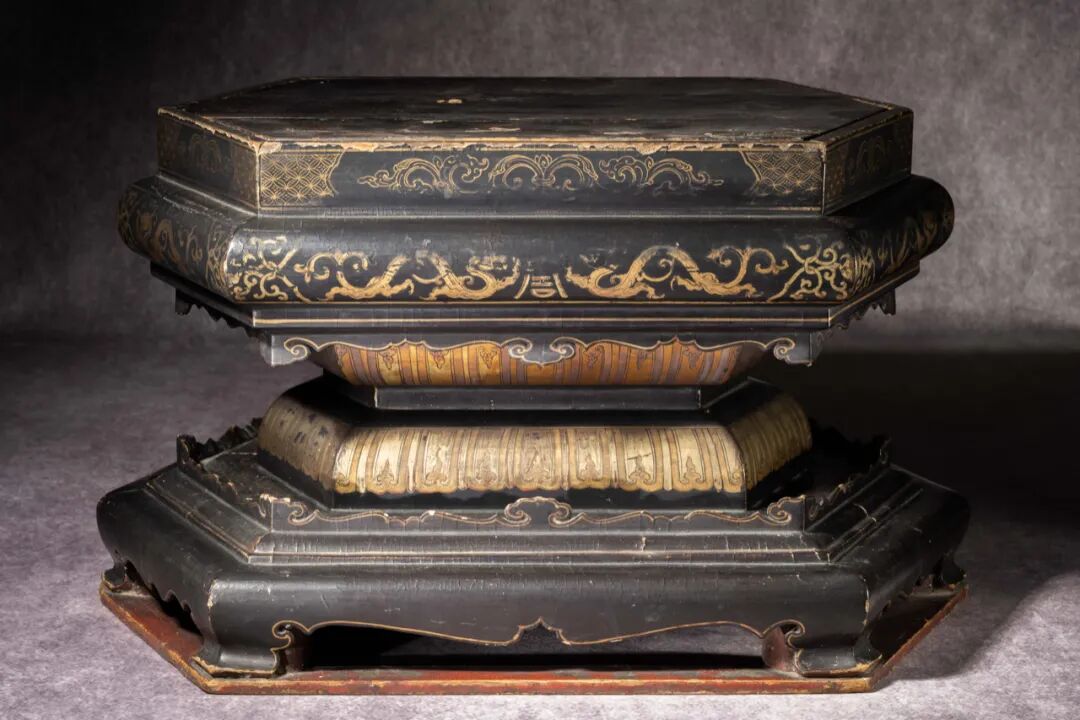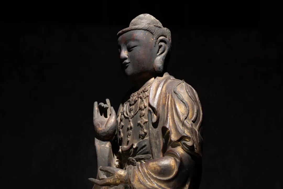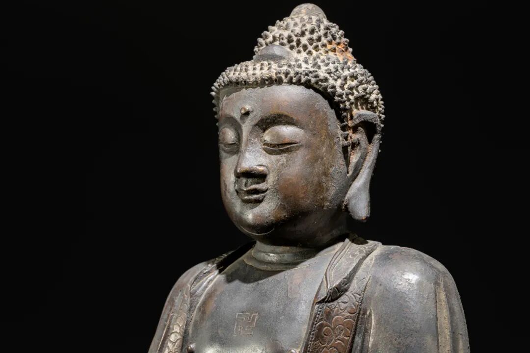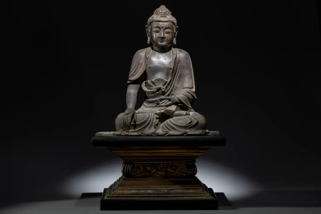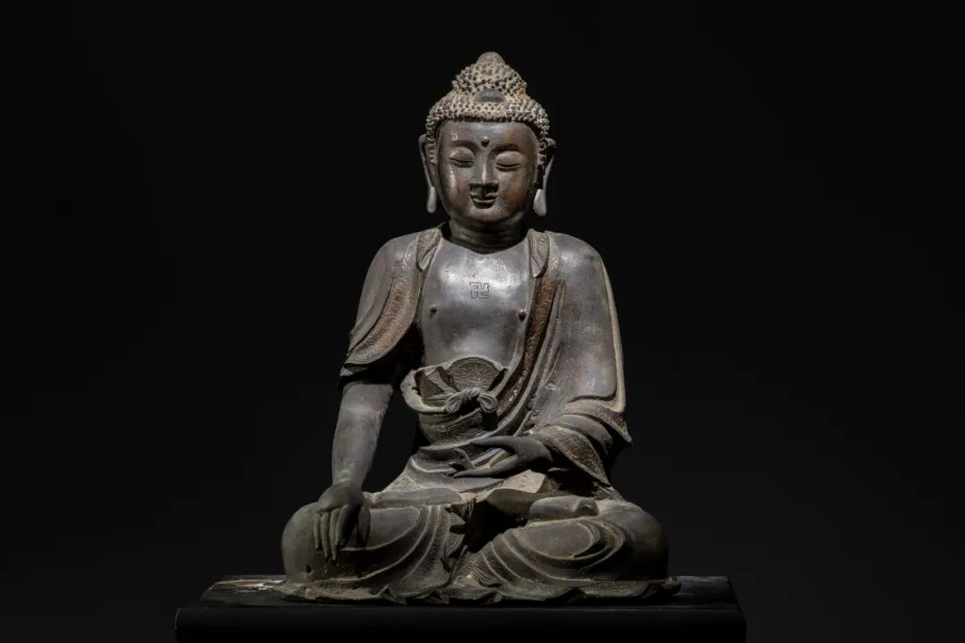 此尊迦牟尼佛坐像为一尊典型的明代中原铜佛造像,仪轨规范,气势撼人。释迦牟尼结全跏趺端坐,左手结禅定印,右手施触地印,是释迦牟尼经过六年苦修,在菩提树下成道的标准成道像。肉髻平缓,头饰螺发,排列整齐,为明代造像标准样式。面相方圆端庄,鼻梁挺拔,眼睑低垂,目光下敛,似俯视众生,神态慈祥柔和,具有典型的明代汉地造像面相特征。袒露前胸,上着袒右肩式袈裟,衣纹写实自然,胸部挺拔,肌肉结实,力量感明显,下身着高束腰僧裙,腰间束带并打结,颇具装饰意味。衣褶布排有序,衣纹流畅自如,厚重写实,极富质感,继承了汉地造像注重衣褶刻划的传统。佛像端坐于木漆金雕花佛台上,更加凸显神圣庄严之感。整件造像体量较大,形体饱满,比例匀称,是一尊十分难得的明代内地古铜造像精品。