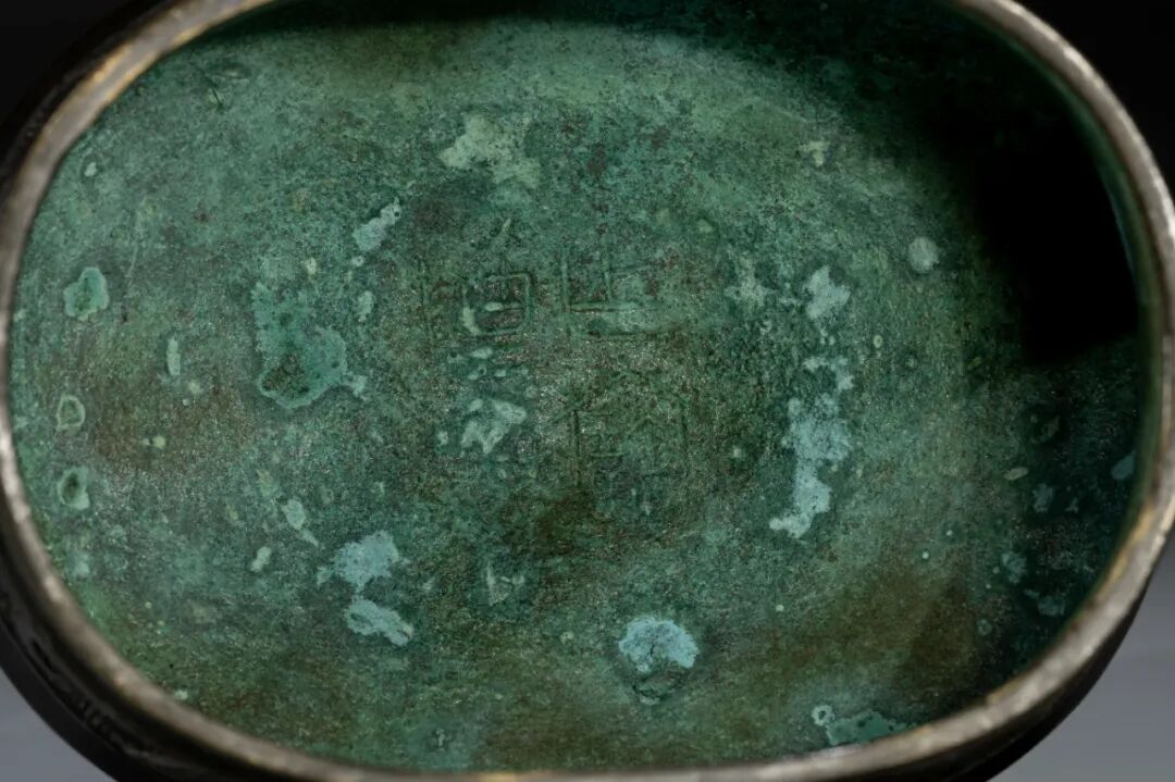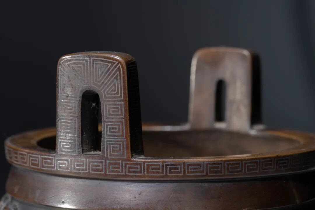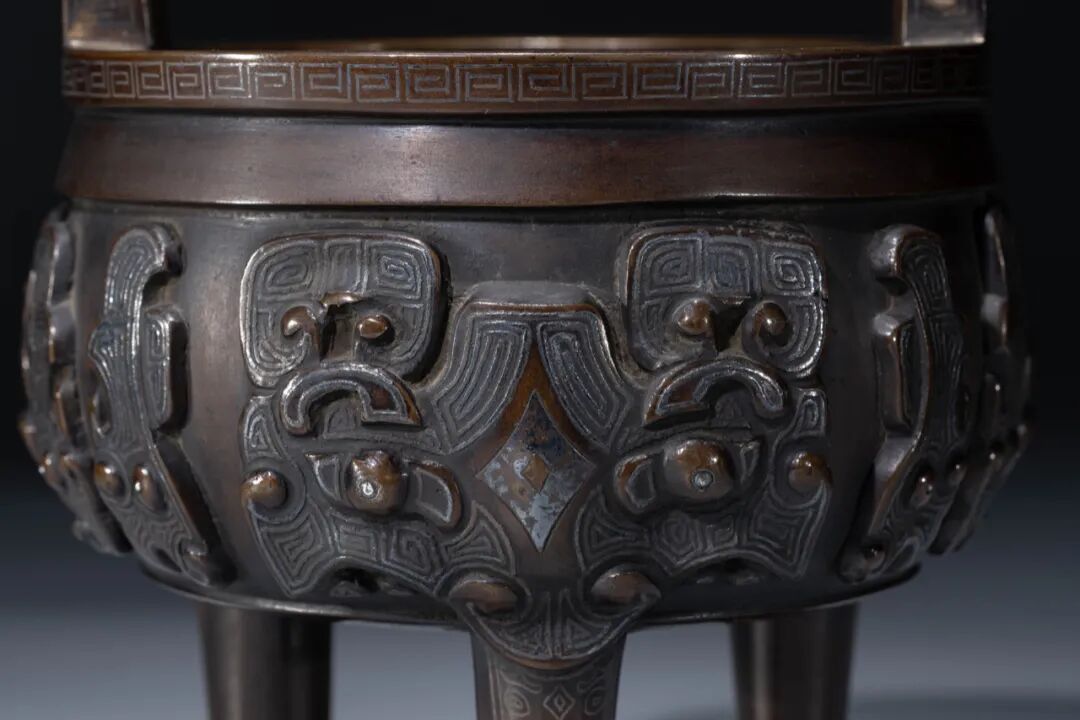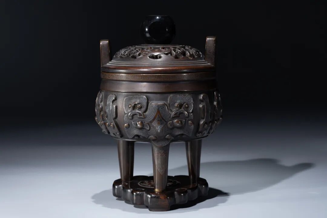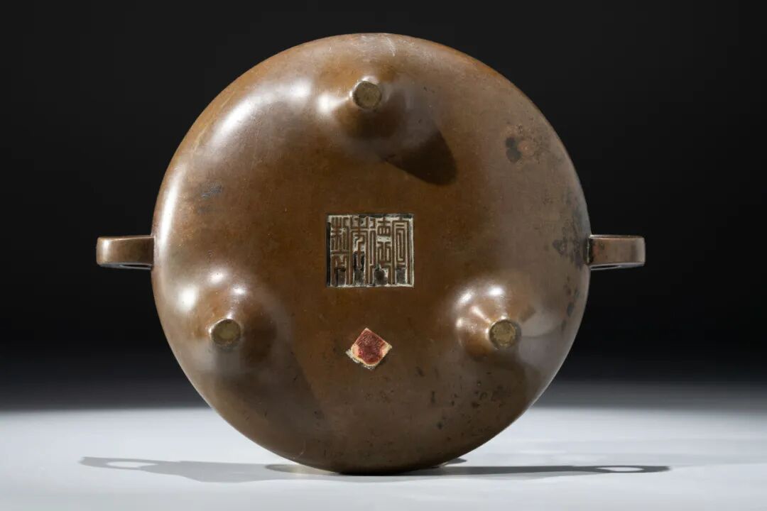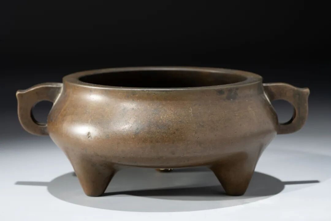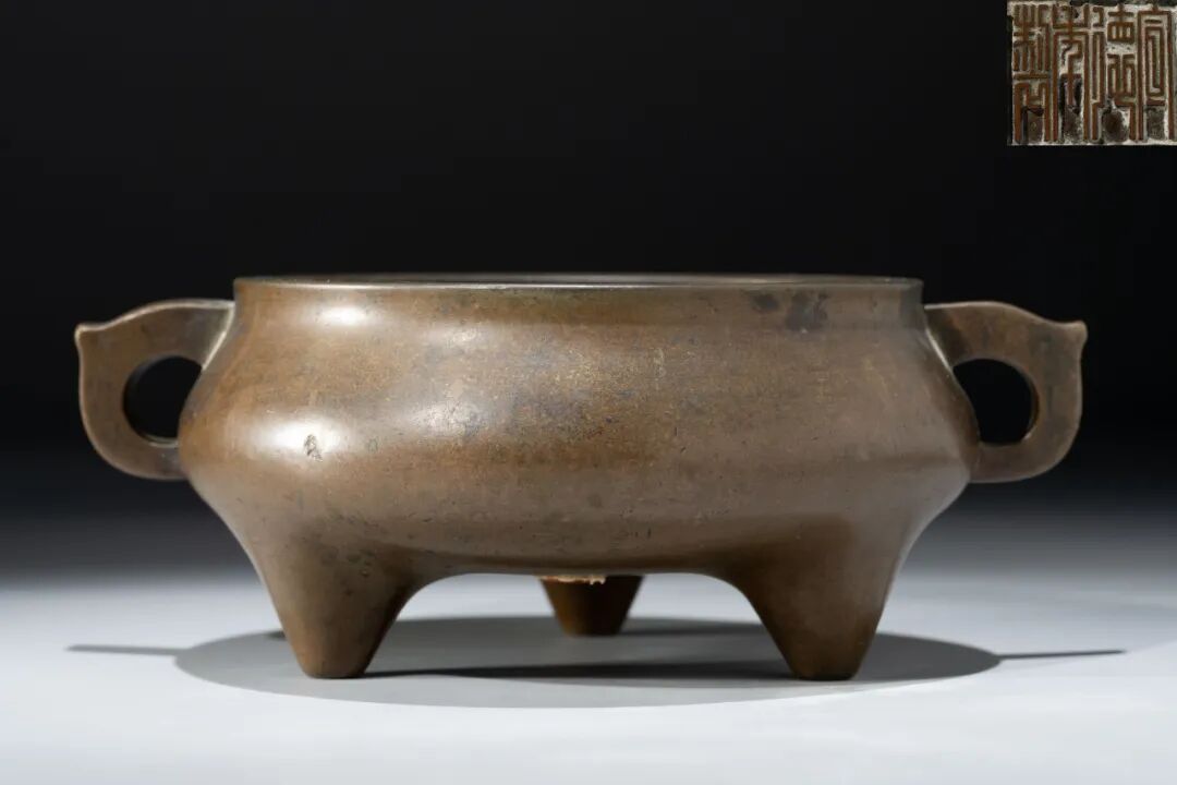 此铜炉平唇口沿,束颈,扁鼓腹,下承三乳足,两侧饰带有翘角的鋬耳,为标准的压经炉造型。压经炉常为礼佛读经时焚香所用,置于案前可以安定心神。炉身素面无纹,宝光内敛,藏经色皮壳柔腻莹润。整器用料精良,手感沉重。底部正中铸减地阳文「宣德年制」四字篆书款,字体规整劲挺。压经炉以其法度严谨,造型素雅庄重,气质和谐沉稳而为人所爱。