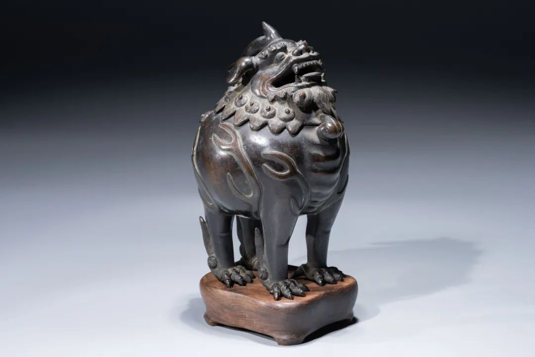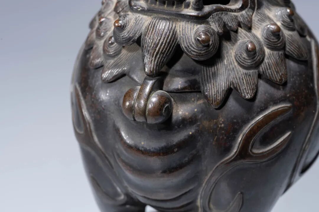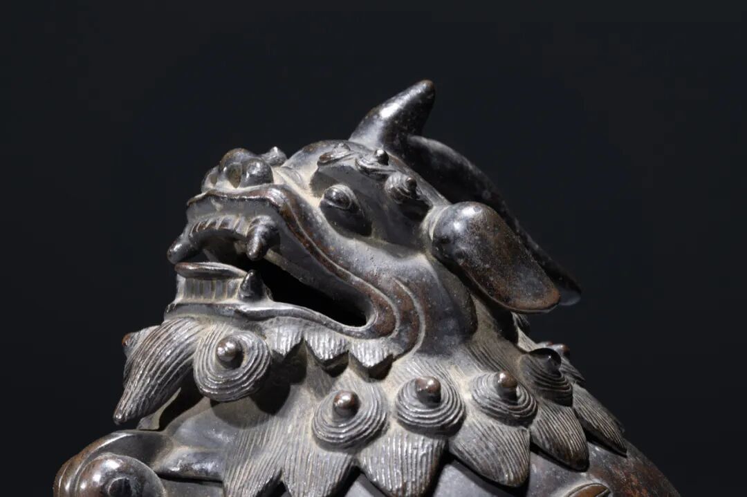 此甪端香薰精铜为材,皮壳浑厚自然。体态健硕雄壮,昂首傲立,双目圆瞪,炯炯有神,整体气势威严;其角如弓,须盘结,头部可掀开,兽身为炉体,兽首为熏盖,腹部中空,可作香熏使用,端口大张,以便香味飘散,设计十分巧妙;兽首、毛发、兽爪等细节刻画精彩,栩栩如生,线条流畅精细;其身布流火纹,尊贵无比,为文房陈设之佳器。