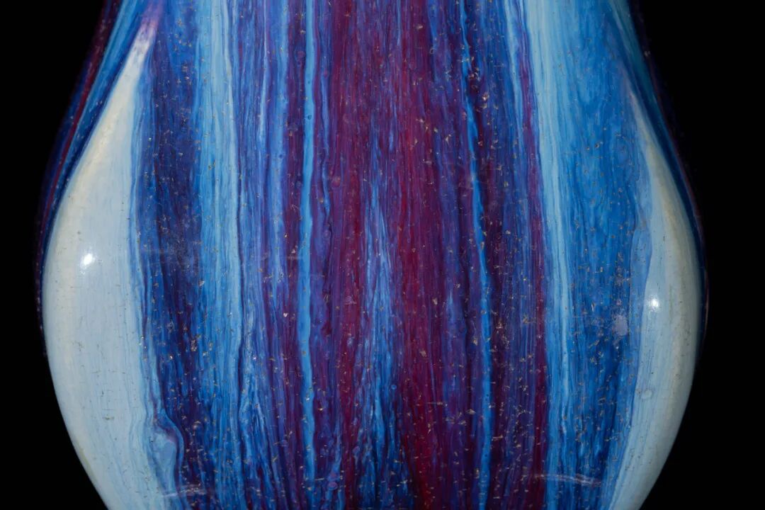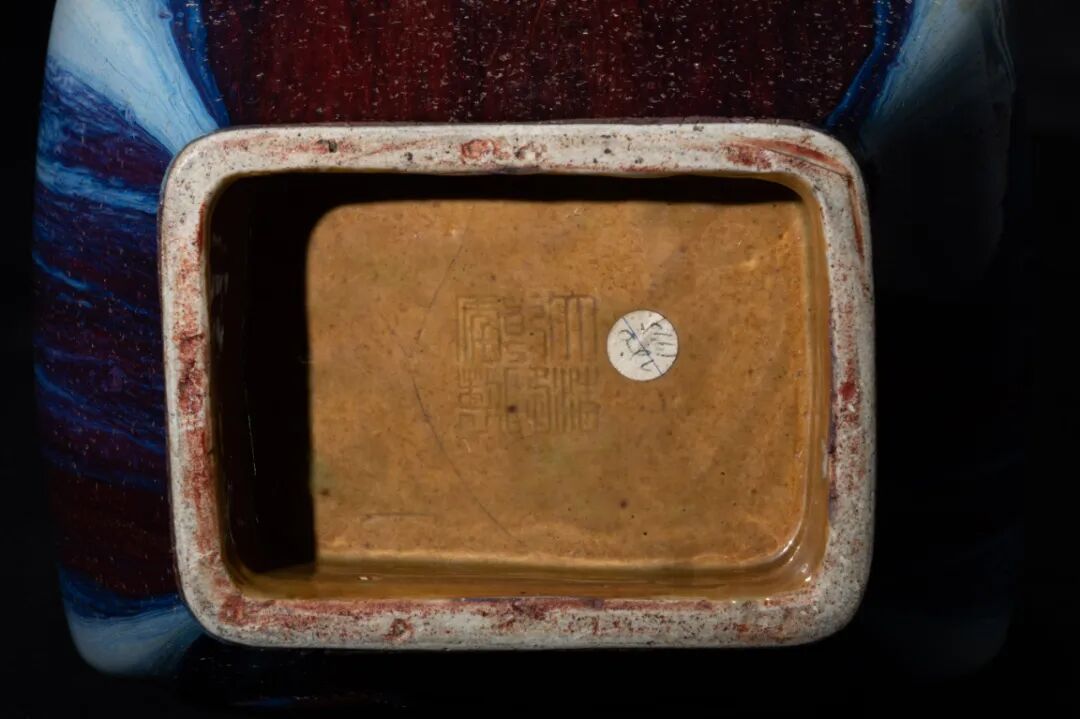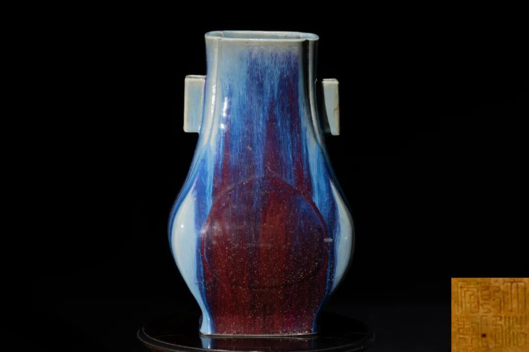 本品呈四方倭角形,器形规整,颈部设管状双方耳,腹部饰桃形凸纹,为平整器身增添变化。通体釉汁肥厚斑斓,红蓝相间,妍丽浓烈。借用唐诗来赞美窑变釉恰如其分,「高山云雾霞一朵,烟光空中星满天,峡峪飞瀑兔丝缕,夕阳紫翠忽成岚」。瓶底阴刻「大清乾隆年制」六字篆书款。本品无论从窑变的发色还是开片的状态看,都应属乾隆本朝的上乘之作。