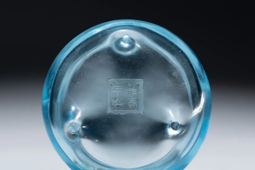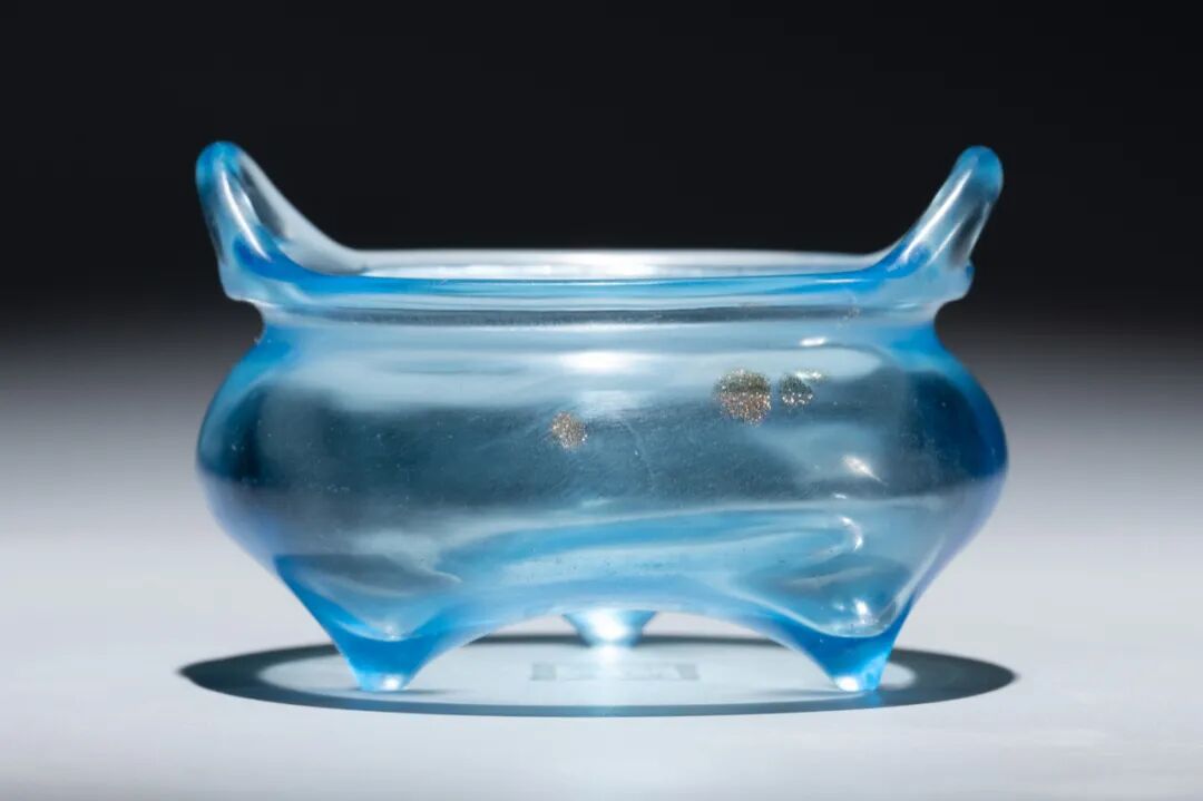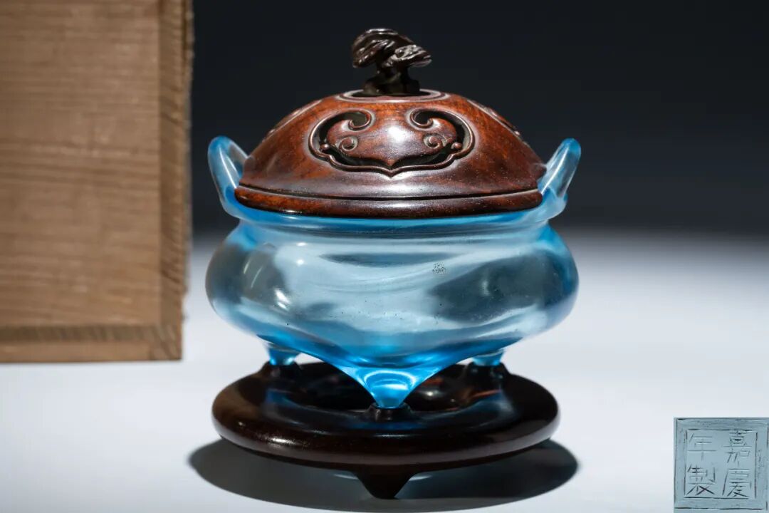 此炉束颈鼓腹,双立耳,乳丁足。通体为透明宝石蓝料,局部点缀金星料,发色纯正,润丽清奇,典雅脱俗。炉盖以灵芝做钮,镂刻如意卷云纹饰,寓意美好吉祥,健康长寿。底刻「嘉庆年制」双框四字楷书款,应为嘉庆宫廷造办处御用之物,具有典型的宫廷艺术风格。