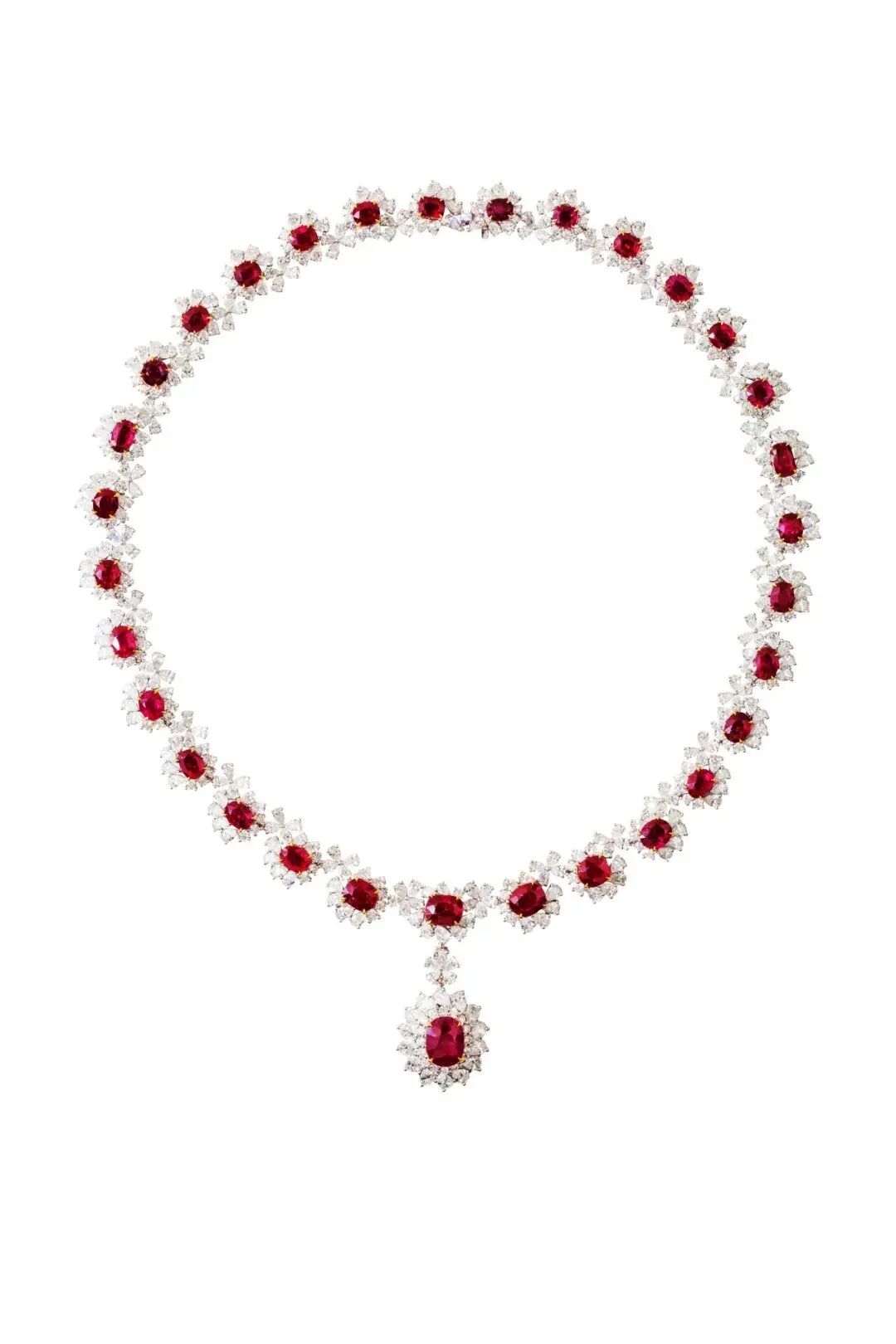 红宝石项链 总重37.9ct和坠子5.02ct,32颗均为产地:缅甸 颜色:鸽血红 附GRS/AIGS国际证书,18K金钻石镶嵌,配钻38.09ct,金重64.04g,项链5.02ct的红宝石坠头可拆下作为配套戒指,一款多用。
