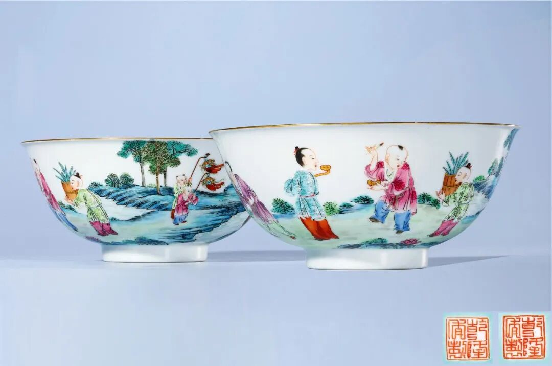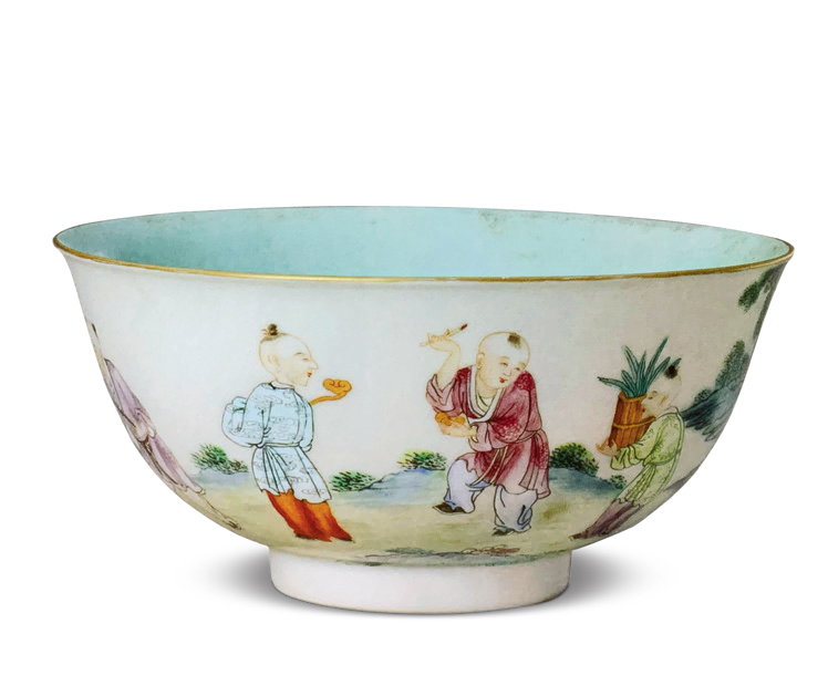 拍品估价:2,800,000 - 3,200,000 人民币拍品造型纹饰与底款皆与故宫博物院藏清乾隆粉彩婴戏图碗相同,参见《孙瀛洲的陶瓷世界》,页 250、251,图 154,乾隆皇帝文治武功,对瓷器更是情有所钟,加之督陶官唐英对景德镇御窑厂的苦心经营,一大批身怀绝技的名工巧匠汇集于景德镇,致使御窑厂的瓷器生产无论在数量还是质量上都达到前所未有的境界。许之衡《饮流斋说瓷》中就有说:“至乾隆以后喜作团彩,稍久风致矣,然于华丽之中别饶葱茜之致,足为清供雅品,弥可宝贵也。”拍品即为一例同时期御窑之佳作。胎釉精良,纹饰描绘细腻,施彩清新雅丽,设色隽秀柔和。腹部以粉彩通景绘婴戏图为主题纹饰,所绘婴孩三两成群,诸童脸庞圆润,体形丰腴,身着各式花衣,手持灯笼、如意、毛笔、元宝、盆景等穿梭嬉闹于山石、松柏间,喻意“必定如意,喜庆吉祥”整个画面热闹非凡,充满了祥和的喜庆气氛。以婴戏为主题,寄托了古人祈求子孙繁衍昌盛的美好心愿,也让人于无声之处感受到无限的童真。碗内及底纯净莹润的松石绿釉色与口沿一圈描金,更加突出强烈浓郁的宫廷华丽色彩。