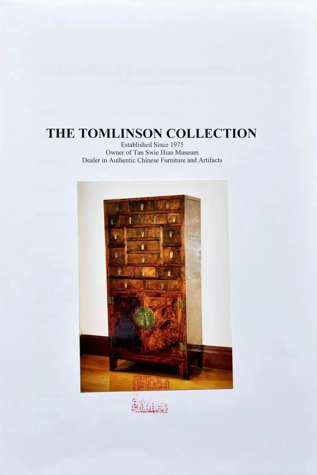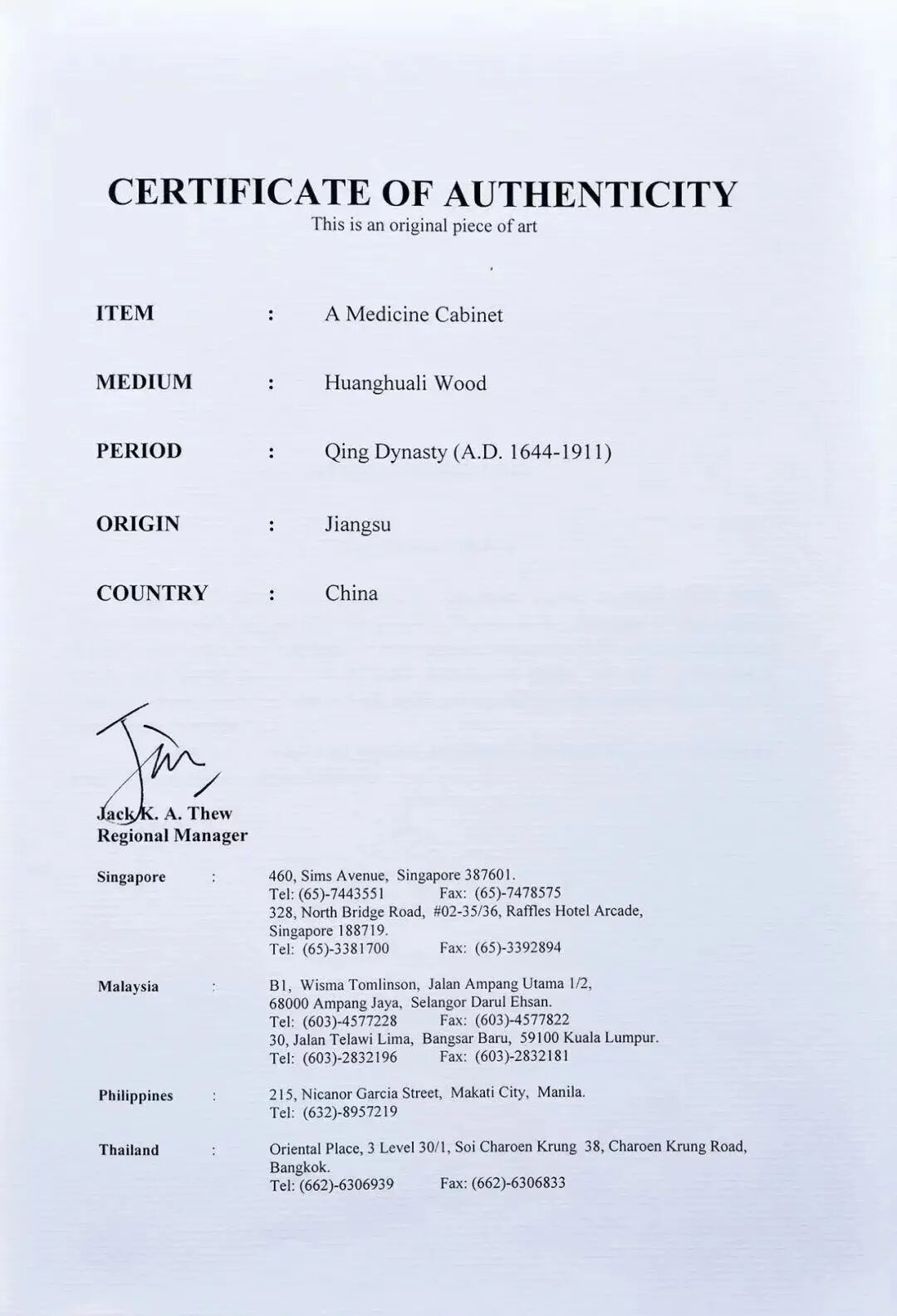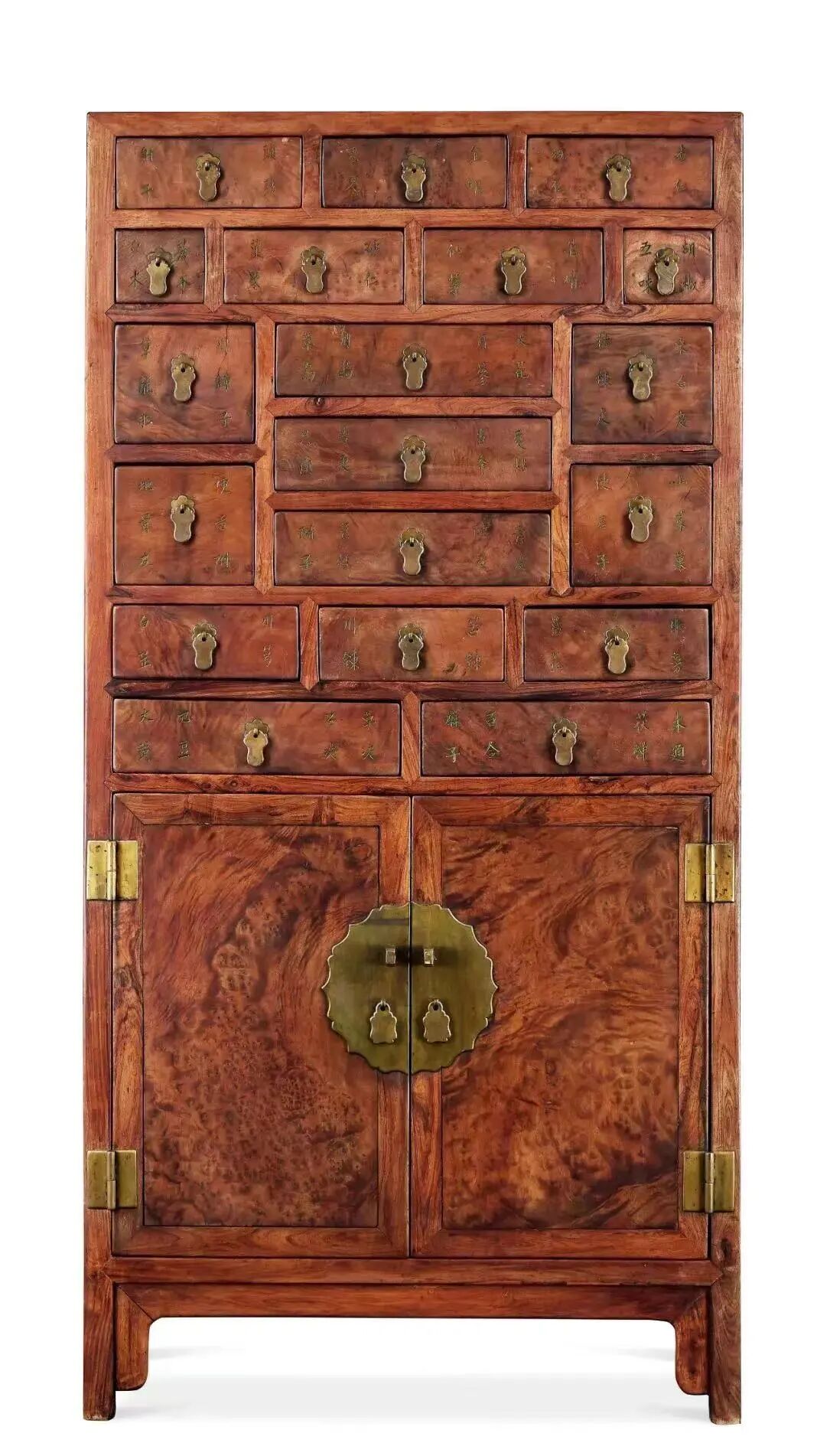此药橱通体用黄花梨为材,抽屉、柜门皆镶瘿木芯板,造型简洁凝练,具明式家具之典型风韵。与常见满设小屉的药橱不同,此件药橱收纳可分上下两部分,上半列十九具大小抽屉,每件抽屉芯板上设光素花形活页,并刻“仙茅”、“草乌”等药材名称,可证其药橱之功用。药橱下半为双对开门,嵌光素的合页、锁闩等铜活,上下呼应,兼其通体木纹流动,整体性颇强。设计精致,用料奢华,无疑当为旧时名门大户所陈设之物。另此药橱为源出新加坡古董商Tomlinson之物,且附有证书。