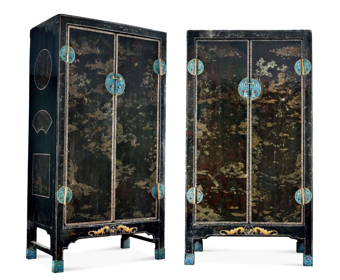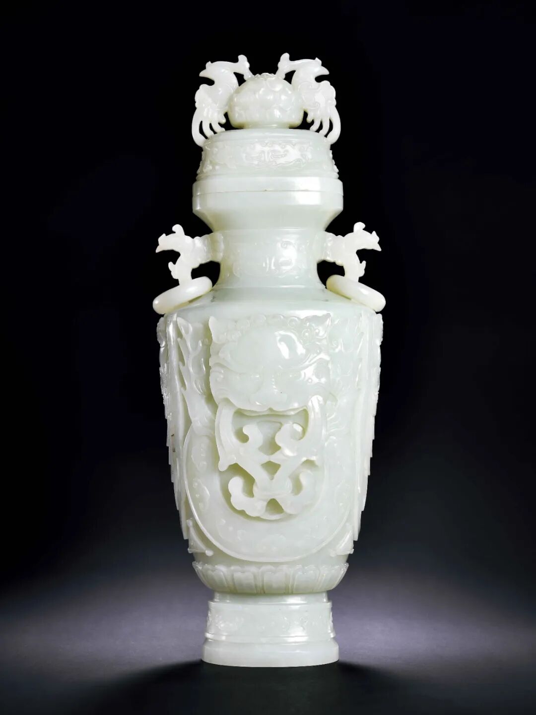拍品估价:1,500,000 - 1,800,000 人民币全组造像造型完美,形象庄严,铸胎厚重,雕工精细,装饰讲究,在造型及工艺上体现了明代中晚期中原地区造像的鲜明风格特点;加之其题材组合完整,体量超常,品相一流,在现存明代中原造像中实不多见,诚为居家供奉及收藏品鉴的上佳之选。拍品估价:1,200,000 - 1,500,000 人民币来源:20世纪伊朗著名投资商、收藏家哈比卜·萨贝特(Habib Sabet)家族旧藏,于1971年6月21日伦敦佳士得拍卖会购得。1.伦敦佳士得,1971年6月21日,Lot.522.加拿大Maynards Fine Art and Antiques,lot.587此玉瓶为白玉质地,莹润清雅,致密纯净。瓶体扁圆,方圆口,直颈微敞,瓶身上丰下敛,高圈足。瓶盖顶作花蕾式钮,并饰圆雕回首凤鸟于盖钮两侧,盖面饰浅浮雕蘷龙纹一周。子母口。瓶颈浅浮雕一周兽面纹,颈两侧出圆雕凤首耳,耳上套一活环。瓶身饰高浮雕兽首衔枝纹与凤纹,兽面狰狞威凛,凤鸟雍容典雅,胫部饰浅浮雕仰莲瓣纹,瓶足部饰一周如意纹。玉瓶纹饰皆带有浓厚的青铜古彝器风韵,雕琢精细且层次分明,为典型清代乾隆期仿古玉器的意蕴。此玉瓶玉质润泽细腻,器型端庄大气,纹饰繁复华美,工艺精湛绝伦,实乃乾隆仿古玉器之佳品。此件玉瓶于1971年在伦敦苏富比释出,为伊朗收藏家Habib Sabet所藏,并曾流传于其家族。Habib Sabet是20世纪一位杰出的伊朗商人,其在银行、建筑、制药、能源等领域都获得了巨大成就,影响整个中东地区。同时Habib先生也是著名的慈善家和古董艺术收藏家,他对古董的收藏热情极广,主要包括18世纪法国装饰艺术品和古代中国玉器。Habib Sabet一些藏品已被Louvre and the Getty博物馆、J.Paul Getty博物馆等一些世界著名博物馆收藏。拍品估价:200,000 - 300,000 人民币题识:簪盍车悬乐且康,引年颐志洛之阳。宛教抚迹寻崖口,不异同时睹会昌。九老八百十六岁,一时翰墨几筵香。披图犹忆东都路,惜未曾逢履道坊。乾隆辛未御题此件如意采用紫檀为柄,头、柄、尾各镶白玉而成,紫檀幽深沉穆,白玉温润古雅。如意头部、柄部和尾部均镶白玉,以镂雕技法饰天鹅荷戏图,寓意万物繁盛。天鹅穿梭嬉闹于荷花绽间的水塘之中,荷花枝叶盘缠交错,写实灵动。白玉琢工精致,层次丰富,典雅大气。如意柄则以高浮雕和镂雕技法雕刻“会昌九老图”,山石深峻,松林苍郁,众老欢聚“尚齿”之会,寓意富乐高寿。如意柄背刻有题识,为乾隆所作《题唐人会昌九老图》一诗,出自御制诗二集卷二十二。落款“几暇怡情”“得佳趣”二印。清代多用如意作宫廷内的陈设或玩赏,尤其乾隆帝尚古博古,喜好在古玉器中遴选珍品,令造办处装嵌于竹木器物之上,自此更是出现了三镶如意,其镶座与嵌件特别凸显,突破平面,采取层层堆栈的技法,富丽堂皇,所谓“得一含三趣可详”,自然非前代初期可比。该如意用料考究高贵,整器工艺精湛,纹饰繁复精美,寓意吉祥如意,侈美奢华,实乃收藏陈设之佳品。尺寸:高 209.3cm;长 113cm;宽 59.5cm拍品估价:2,000,000 - 2,600,000 人民币此对黑漆嵌螺钿方角柜体量硕大,整体保存完整,装饰材料丰富,极为难得。立柜为木胎髹黑漆嵌螺钿,镶圆式铜珐琅合页。方角柜造型平素,柜身四面齐平,正面对开两门,柜门攒框装心,门框与门心平齐,下设直条牙板,四腿下包铜珐琅套足。柜内中间平设抽屉两枚,上设一承板,并于窄长的看面嵌卷草花。此柜独特之处在于柜身装饰,周身髹黑漆,黑漆黑中泛紫,较为致密,其上嵌螺钿成山水风景及人物故事图,螺钿纹样工艺细致。近景与远景遥相呼应。薄螺钿又称五彩螺钿,是取小贝壳之极薄的内表皮,这层内表皮即薄又硬,极难剥取,剥取之后用小镊子夹着磨制成所需形状,贴嵌在漆地上。此种技法难度和花费之高,可说是宫廷和民间工艺的分野。这种工艺在明代和清代早期最为宫廷与上流社会所推崇,清代中期后,随着国运衰退,此种工艺几乎已经难得一见。