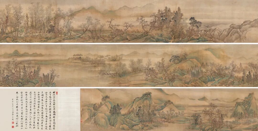 拍品估价:1,000,000 - 1,600,000 人民币纪录:纽约佳士得,1990年5月31日拍卖会,Lot.158,成交价为 68200.00(美元)。乔崇烈(1661-1721),字无功,号学斋,江苏宝应人。幼承家学,博览群书,工诗词,擅书法,康熙丙戌年(1706年)进士,授翰林院庶吉士。与朱彝尊等当时名儒倡和往来。乔崇烈善书法,作品现在很多博物馆如故宫博物院都有藏品。作为江苏宝应的名门望族,乔氏一族对于清代前期的几位画坛巨匠都有着自己独到的眼光和交往。与王翚生活于同时代,且有着特殊的社会地位而言,乔氏“捉刀人”的评价,不光说明了王翚当时的作品代笔的情况非常多见,而且门人代笔人尽皆知,反而真笔非常不易得,更从侧面证明了本卷的可靠性。康熙二十八年(1689年),康熙帝第二次南巡归来后,开启了《南巡图》的绘制工程。王翚由弟子宋骏业推荐,于康熙二十九年开始,担任绘制《南巡图》的主笔者。在北京的旅居见游中,王翚与很多权贵文士之间的交往愈加频繁,从乔氏父子、吴正治,再到高士奇、宋荦、王掞等等,这种倚靠权贵以笔会友,又能从其收藏中得到滋养,完成再到自己艺术的反哺。本幅临王维《早春图》,用手卷横幅的形式描绘着早春山间的平远景象,山涧中的流泉开始潺潺流动,远岗层林中浮动着淡淡的雾气,树梢开始抽芽。也有数人骑牛折枝踏青在乡间, 卷子中最为夺目的就是施以的青绿色,象征着早春郁郁勃发的生机。