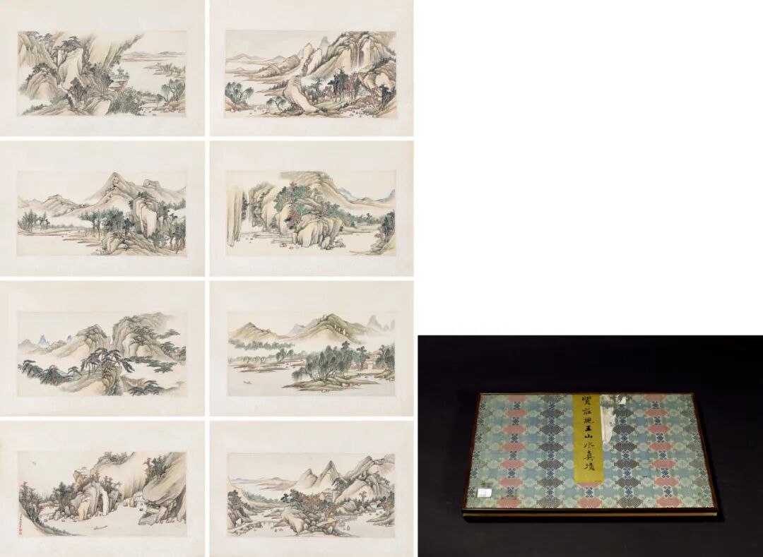拍品估价:800,000 - 1,200,000 人民币1.爱新觉罗·永瑢(1743-1790),号九思主人,清朝宗室大臣。乾隆帝六子,乾隆二十四年冬,出继给慎靖郡王胤禧,乾隆五十四年,晋封质亲王,五十五年薨,年四十八岁,谥号为庄。永瑢除了在政治上对有建树外,他还是一个多才多艺的人。他工诗、擅书画,兼能天算,还是个喜欢藏书的人。他的书法得徐浩笔意。画花卉古淡苍逸,兼有少谷、沱江之胜;山水则由王时敏祖孙上窥大痴(黄公望)。他身后流传下来为数不多的绘画,从中可以让观者感受到当时的满清贵族在汉文学、艺术上的造诣,而且也从一个侧面反映了清初历代皇帝对皇子严格教育的成果。他的传世画作还有《严阿清溪图》、《岁朝图》、《枫溪垂钓图轴》等。此册落款“子臣永瑢恭画”,为宫廷供物的典型格式,为画家用心之作。臣字款,是明清两代宫廷书法与绘画的特色,即作书画者在自己落款名字前加一个字体略小一号的“臣”字,通常在右上角,为谦卑之意,这是明清实行严格的等级礼仪制度的产物,臣字款书画,都是用作给帝后观赏之用,多数工整细致,由于曾经御览,题材也一定是吉祥喜庆之类。