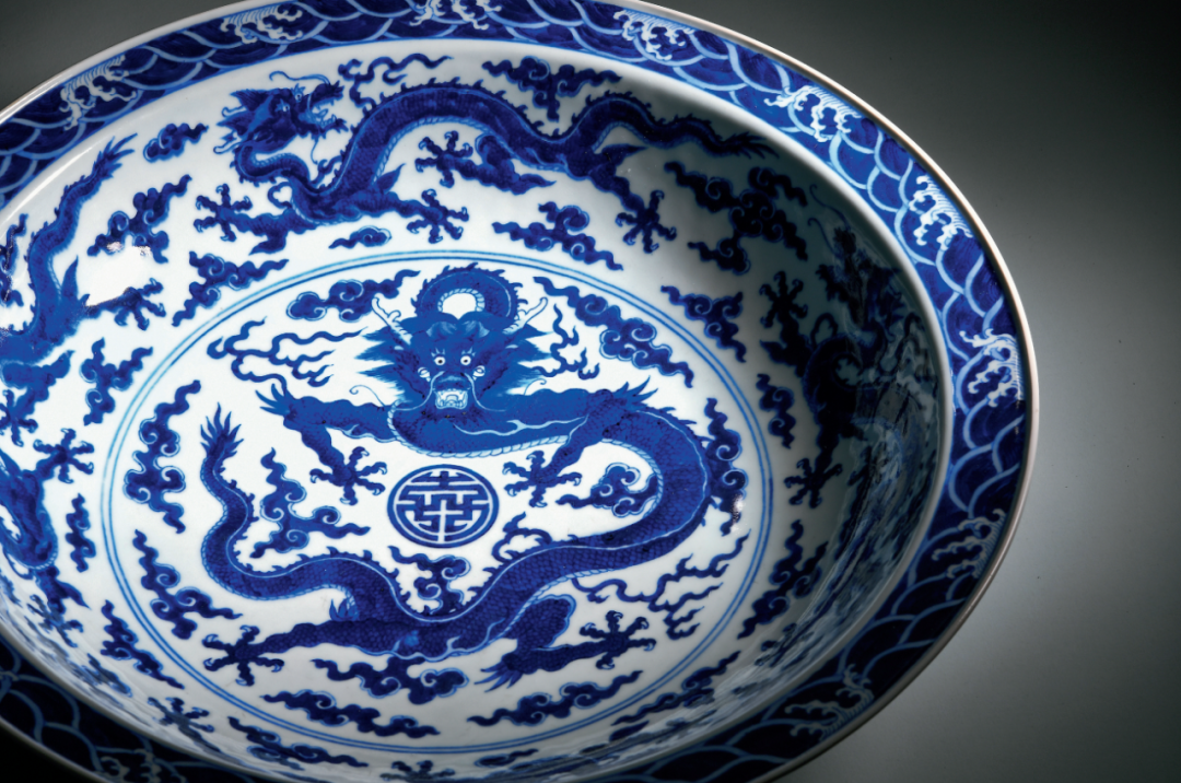 拍品估价:2,600,000 - 3,000,000 人民币*本件拍卖标的处于保税状态下,详情请见本图录《保税拍品竞买须知》。乾隆朝此样式大盘较为少见,此种跃龙捧寿纹样仅在故宫博物院藏清乾隆青花龙寿纹螭耳六方瓶(《故宫博物院藏文物珍品大系·青花釉里 红(下)》,图 126)及南京博物院藏清乾隆青花海水红彩龙纹盘、清乾隆淡黄地青花龙捧寿纹六棱瓶(《中国清代官窑瓷器》,页 278)这类器物中有所体现,而此类瓶之造型与纹样于清宫记载中皆以出自唐英之手而闻名,亦可侧面证明此盘之纹样源自唐英督陶之时定夺。本品形制硕大,气势磅礡,侈口弧壁,下承圈足。通体青花纹饰,内壁盘心绘五爪捧寿立龙,气势威严;其外绘四组飞云腾龙,飞龙矫健灵动,腾跃于祥云之中,两两相顾,相映成趣;大盘折沿处饰青花海水纹一周。外壁以色彩浓郁之青花满饰一周海水江崖纹。所绘龙纹威严霸气,尤其正面龙显得神采奕奕,身姿动态凸显其力量感,面部细节精妙,龙须皆以细小之阴线勾勒渲染而成,再细观龙爪的处理方式,又颇具永宣龙纹之遗韵,使得整体独具韵味。盘外壁所绘海水江崖也不同于常见的此类纹饰,线条和渲染都十分独到而恰当,远观彷佛海水澎湃扑打江崖之上,不免令人赞叹其妙。青花发色深沈凝重,颇为典雅。加之本品体量颇大,造型规整,体现了龙腾四海的皇家威仪。外底心青花书「大清乾隆年製」六字三行早期篆书款。有清一朝,雍正年间始制纹饰与此相类之大盘,时世宗尝遣送清宫所藏古董瓷珍至景德镇以资效仿,或曾命依明初样式制如此大盘。清朝艺匠,对于空间布置娴熟精准,巧手创思,成功将小器样式转用于大器之上。此盘所饰新颖元素,兼容相合,整体和谐天成,全然不觉稀疏空荡或拥塞逼簇,天真率意,展现纹样精髓。其盘心龙纹由侧身变为正向,翻腾巨浪不再遮掩龙体,凸显其矫健霸气。艺匠技艺精卓,盘沿巧饰波涛海水纹带一道,使不同饰纹元素之间更具凝聚力:对比明代小盘布局构图,如斯安排与硕大体型较为相称。乾隆一朝,或曾以雍正年间样式为据,续烧龙纹大盘。雍乾两朝所制,初视几近无二,然细观,便得个中迥异。较之雍正纹样,乾隆器上绘饰更见规整谨慎,所绘舒卷瑞云、波涛涌浪更显整齐统一。两朝大盘之别,可见二人品味之异。翻阅国内外各大公私典藏,此盘之形制及纹样延烧于雍正一朝,含祝寿之意,皆为当时督窑官唐英亲自画样,应多用于皇宫席宴及特定隆重之祝寿场合,属万寿级别的官窑极品。相类者多属于雍正时期,可见延烧之脉络。可参见《清世宗文物大展》,页 282,图 II-100 之龙纹大盘。