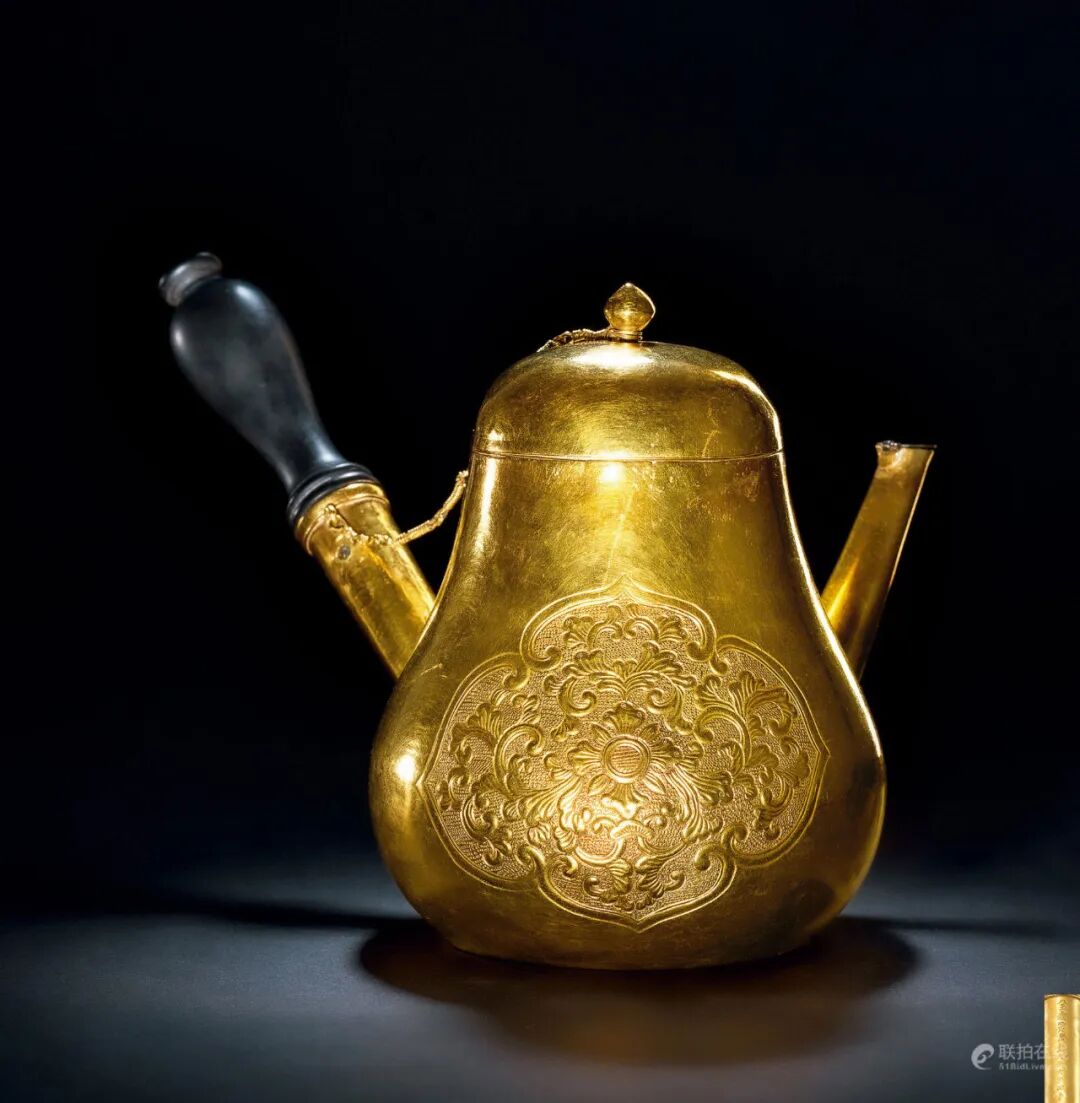 备注:香港苏富比,2007年10月9日,Lot1329拍品估价:6,000,000 - 8,000,000 人民币此壶造型小巧,观其容量制式,当为帝王本人使用,级别极高。木质把手与清宫旧藏雍正铜器相仿,黄金光艳华丽,又颇为符合乾隆之审美趣味,当制于雍乾时期。由于黄金极其珍贵,有时宫中为了铸造新器,常需熔化旧有金瓶、金盆、金伞等。得以传世至今,甚为难得。本壶造型或取自唐宋时期煎茶之器急须。急须,短流而一侧有横直柄,唐代常在南方使用,长沙窑多有制作,宋代亦多见于东南地区。北宋黄裳《龙凤茶寄照觉禅师》中云,“寄向仙庐引飞瀑,一簇蝇声急须腹”,其后注“急须,东南之茶器”。急须后传至日本。明清之际,急须极为稀见,以黄金制成,则更是罕有。参阅:卡尔·坎普旧藏一乾隆款金器。苏富比香港2008年4月11日上拍,编号2305,成交价港币3616万。