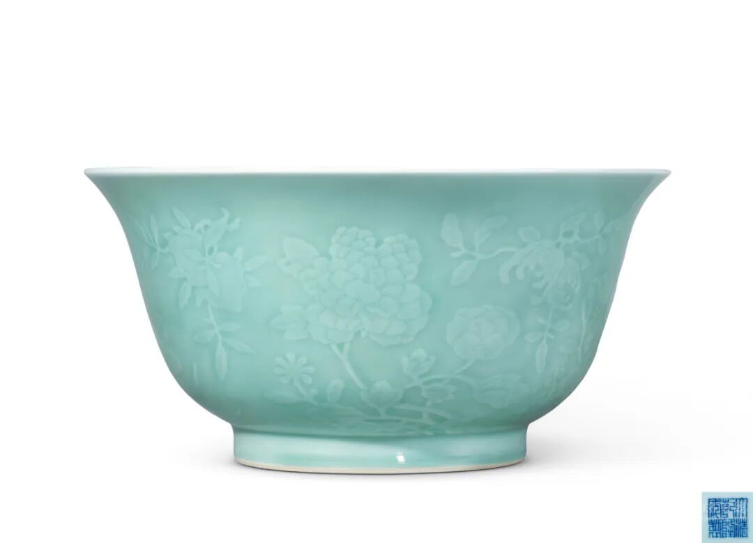 2.香港佳士得,1996年11月3日,Lot.5705.香港苏富比,2012年10月9日,玫茵堂珍藏一重要中国御瓷选萃之四专场,LOT 332.《徐氏艺术馆·陶瓷篇IV·清代》,香港,1995年,图363.《玫茵堂中国陶瓷》康蕊君,伦敦,1994—2010年,卷4(l1),353页,图1804拍品估价:2,000,000 - 3,000,000 人民币此式粉青大碗为雍正一朝首创,乾隆早期御窑与雍正一脉相承,除款识有别外,余皆极为接近。此碗造型巨硕恢弘,深弧壁,撇口,圈足。器内无纹,碗外雕饰折枝四时花卉,牡丹、莲花、芙蓉、翠菊、茶花、桃花,皆自圈足而出,上方间隙则添饰桃、荔枝、石榴及佛手。其雕工流畅利落,细致入微。通体及足内满施粉青釉,色泽匀净莹润。底署青花“大清乾隆年制”六字三行篆书款。整器端庄的造型、精致的纹饰与温润似玉的粉青釉浑然一体,显示出乾隆朝高超的烧瓷技艺,体现出美观与实用的完美结合,达到了“合于天造,厌于人意”的艺术境界,为乾隆时期精品。拍品最早为徐展堂静观堂收藏,并著录于《徐氏艺术馆》、《徐氏艺术馆·陶瓷篇Ⅳ·清代》。1996年由香港佳士得举槌,此后被Eskenazi收入麾下,后又传至玫茵堂,并录于《玫茵堂中国陶瓷》中,直至2012年香港苏富比“玫茵堂珍藏──重要中国御瓷选萃之四”专场拍出,此后又为张宗宪所藏至今。拍品来源清晰,皆为名家递藏,足可见其珍。