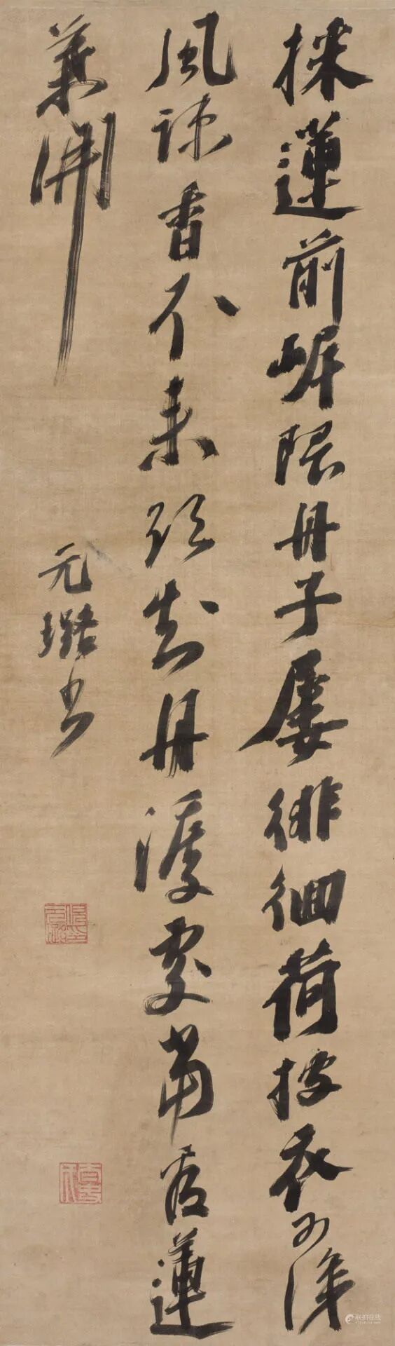 题识:采莲前岸隈,舟子屡徘徊。荷披衣可识,风疏香不来。欲知船度处,当看莲叶开。元璐书。出版:《倪元璐书法精选》,第25页,河南美术出版社,2008.3。拍品估价:800,000 - 1,000,000 人民币
