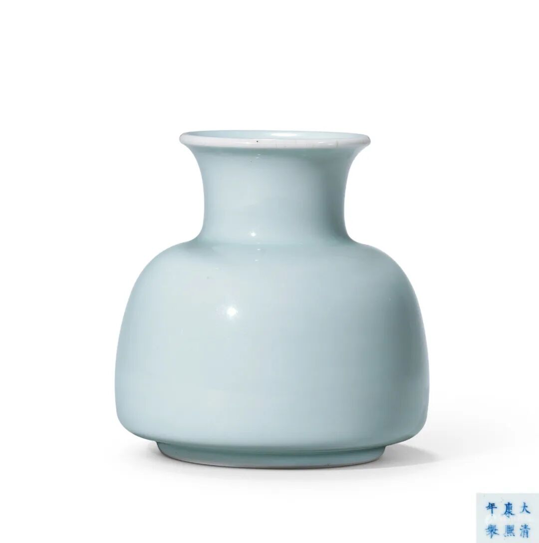 2.香港佳士得,2014年11月26日,Lot3265拍品估价:1,200,000 - 2,200,000 人民币本品造型独特,端庄稳健而又不失秀美之风。尊撇口,圆唇,束颈,丰肩鼓腹,圈足。底书“大清康熙年制”六字三行楷书款。通体青釉素裹,釉面肥腴,色调匀净,予人以无限恬静之雅意。造型以圆柱形,束颈又使得器物线条富有变化,更使器物充满着灵动,在康熙朝器物造型中非常罕见,整体线条舒展柔美,富有韵律感,配合粉青一色宛如天成,传承了宋代高洁至清之韵,是对“美到极致是自然”这一境界的经典诠释。根据其大小和形制,应为文房陈设或案头花插佳器。如此曼妙可人之品,置于书斋之案头,格调高雅,供其撷取四季之芬芳,益增其文思与灵感,实得文人雅致淡然旨趣。