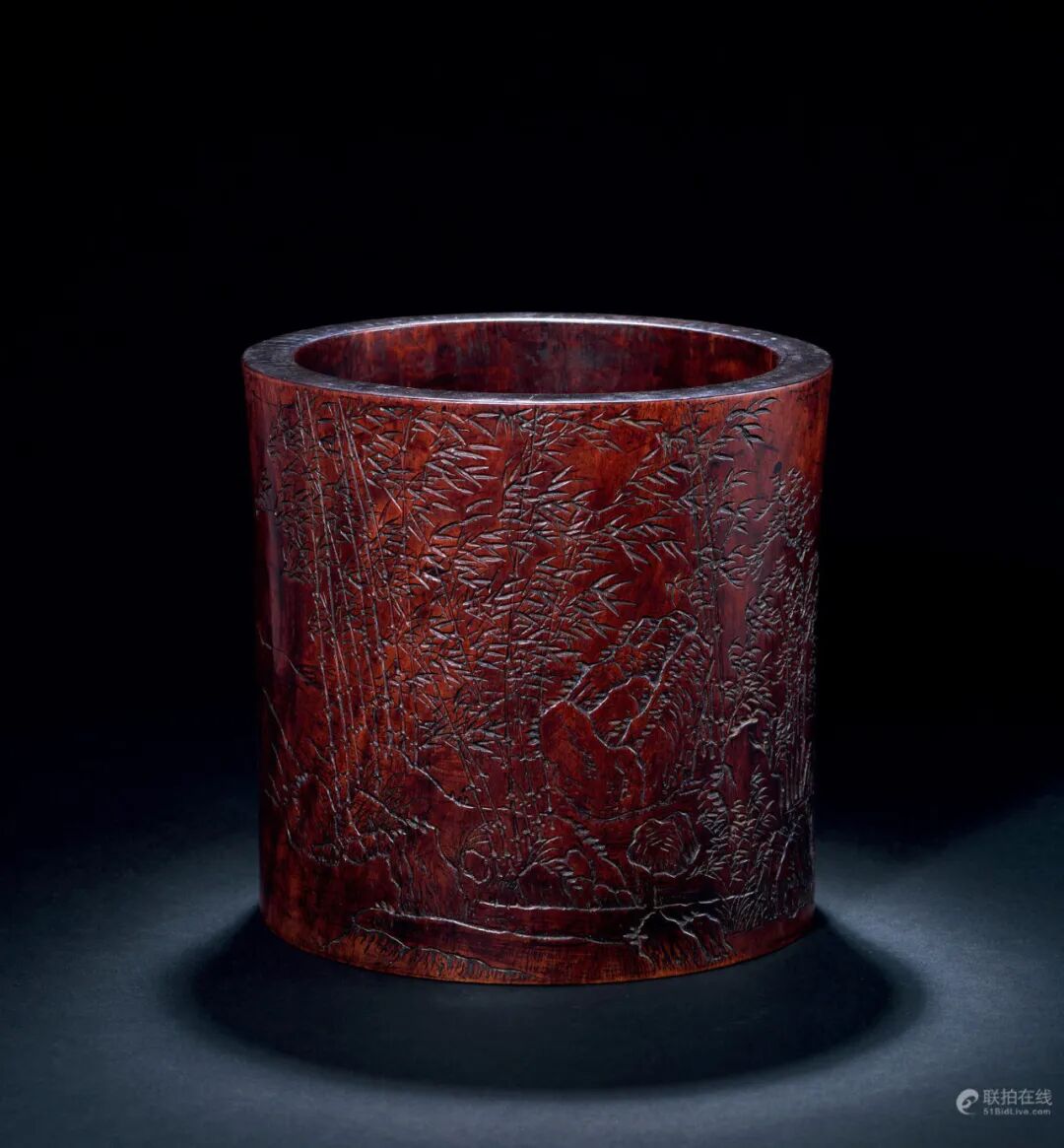 清乾隆 「周芷岩」刻张鹏翀题竹石图诗文黄花梨大笔海拍品估价:2,000,000 - 3,000,000 人民币笔筒取黄花梨大木为之,材料难得。黄花梨色泽沉敛红润,文理美观,包浆厚重。刻竹石图于其上,山石稳盘于地,竹叶似飒飒而动,构图简练,刀法老辣,气韵天成。侧行书刻诗文两首,落「张鹏翀」、「芷岩并镌」款。诗文平地深雕,类似刻碑,而以阴刻技法所雕剔之竹石,似不用稿本,一气呵成,竹叶迎风摇曳,似可闻沙沙之声,连无形的风都似乎跃然图上。此件笔筒为目前所见周芷岩所制题跋最长、体量最大、品质最精之作。其无论从布局能力,雕刻技巧,还是文化内涵都是一件无可挑剔的杰作,当为周芷岩艺术成熟期的代表作,极富南宗画意和文人气质。