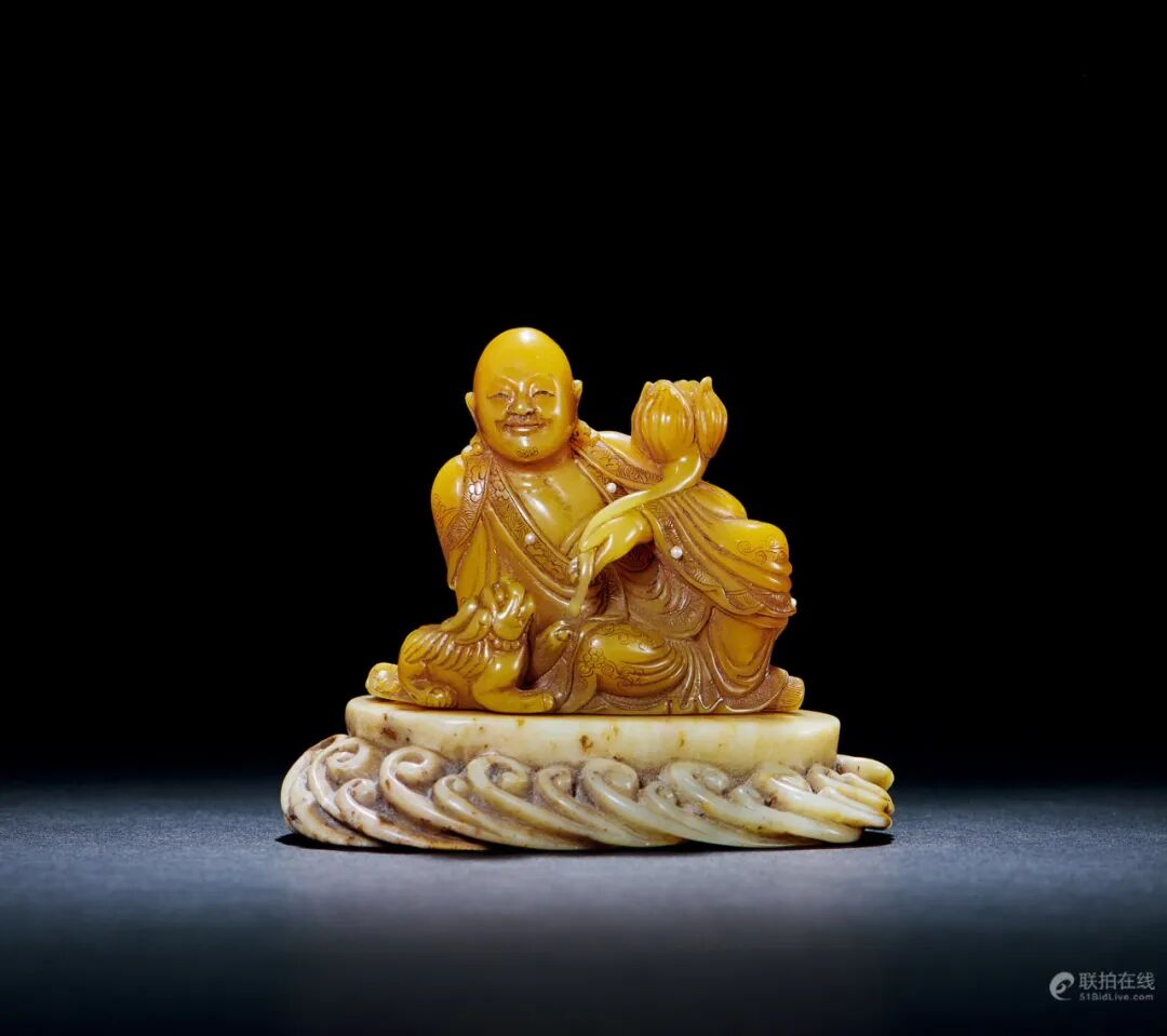 拍品估价:3,000,000 - 4,000,000 人民币本尊罗汉像选取上等田黄石依型雕琢而成,石材通身娇黄莹润。圆雕伏虎罗汉,神态安逸肃穆,法相庄严。侧身而坐呈倚靠姿态,一只小螭虎则趴在罗汉脚边,温顺可爱。背后刻有「尚均」二字款识。底座呈波浪状,与罗汉造型搭配协调,别有一番韵味。因田黄珍贵稀少,雕刻时尽可能减少其损耗,因此在选材,构思,色彩展现上极见功力,展现了雕刻大师常年积累的深厚底蕴。周彬,字尚均,传为清康熙时福建漳州人,传曾被招至宫廷做御工,擅长人物雕刻,尤精印钮制作,所作兽钮、博古印钮,浑古朴茂,精细工巧得鬼工之誉,常于博图案中或锦边纹饰中刻「尚均」二字作记,是清初制钮第一高手。佛造像等人物圆雕亦娴熟精湛。现故宫博物院藏有其所制人物及印钮作品。