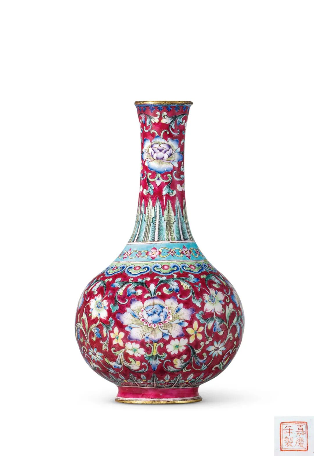 1.伦敦佳士得,2007年5月15日,Lot1692.巴黎佳士得,2013年6月13日,Lot3554拍品估价:400,000 - 600,000 人民币拍品撇口,长颈,小巧精致,纹饰繁缛和谐,番莲纹刻划丝丝入微,胭脂红地衬托鲜艳珐琅,牡丹及莲纹以叶纹相间,乃典型中式纹饰,其绘画风格却近于西方洛可可艺术,卷叶纹及颜色的选择,带有法国十八世纪后期装饰艺术之华美,此表现手法属中西合璧,可见此瓶乃艺匠迎合皇帝品味而制,珍罕独特。多为置放多宝格或各式精制宝盒中,以供皇帝御赏,昔时或与袖珍雅玩同储一匣。