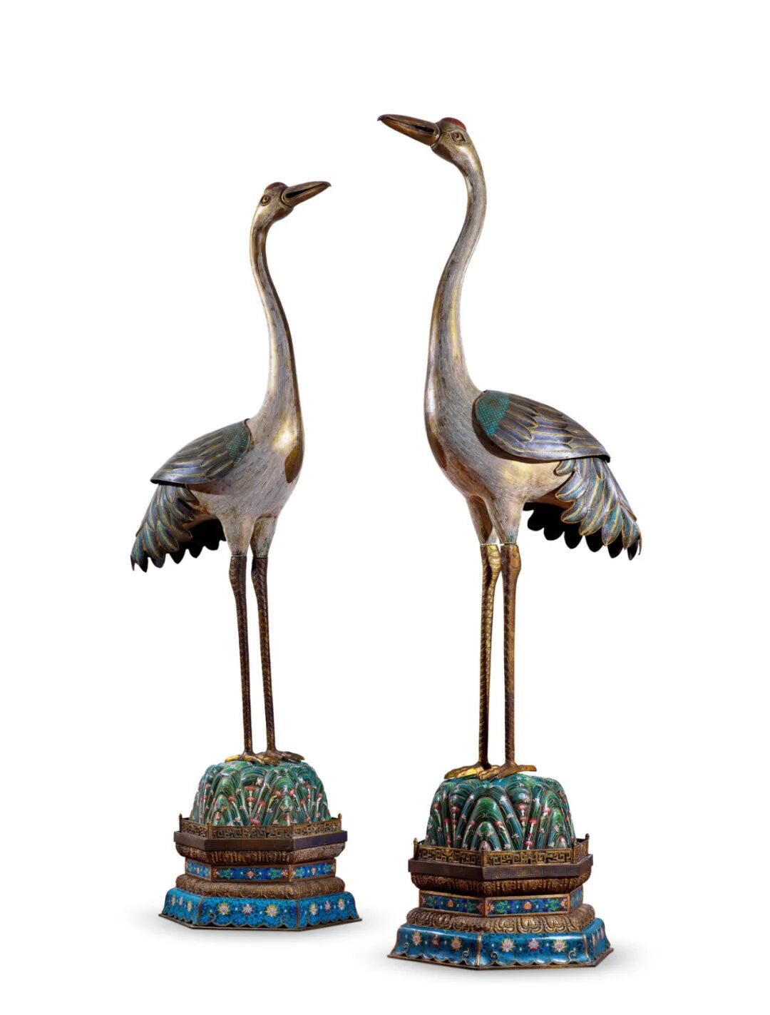 拍品估价:1,200,000 - 2,200,000 人民币此对仙鹤身材修长,昂首挺胸,立于仙山之上,鹤顶为红色,颈下、双翅及尾部装饰黑羽,其余部分为白色,整体釉色淡雅,釉面平滑,仙鹤羽毛线条流畅,层次分明。其下是六方须弥式底座,束腰处以掐丝珐琅装饰缠枝花卉,上下分饰如意云头及莲瓣纹。整体鎏金,金色完好。本对仙鹤、仙山完美结合,仪态优雅,神韵佳妙,工致华美,材质精良,寓意吉祥,彰显出皇家之尊贵气质,寓意皇权万年长久。