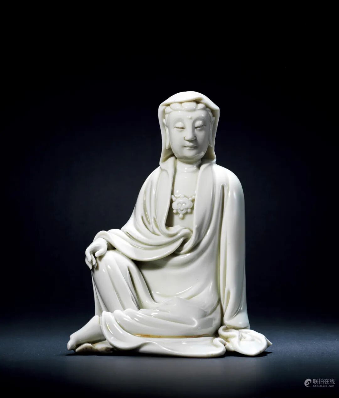 观音以「自在坐」式,右膝曲起,左足半趺,右手前伸,置于膝上,左手撑于膝后;发丝细密舒整,以幅巾披之;额面宽阔,面容饱满,神态自在安详,双目微闭下敛,法相清净庄严,精美璎珞佩于胸前。通体着天衣,褶皱疏密有致,飘逸流畅,悠悠而垂,一幅自在之态,可谓「理圆四德,智满金身」。造像形态优美,古朴典雅,端庄大方,不事缛纹,比例精确,工艺精湛,生动刻画了观音菩萨普度众生的慈悲之心与庄严祥和之相,彰显观音「大慈大悲,如月如日」的内在精神。胎体致密,白釉温润细腻似凝脂,乃典型的明晚期德化窑白瓷特征。