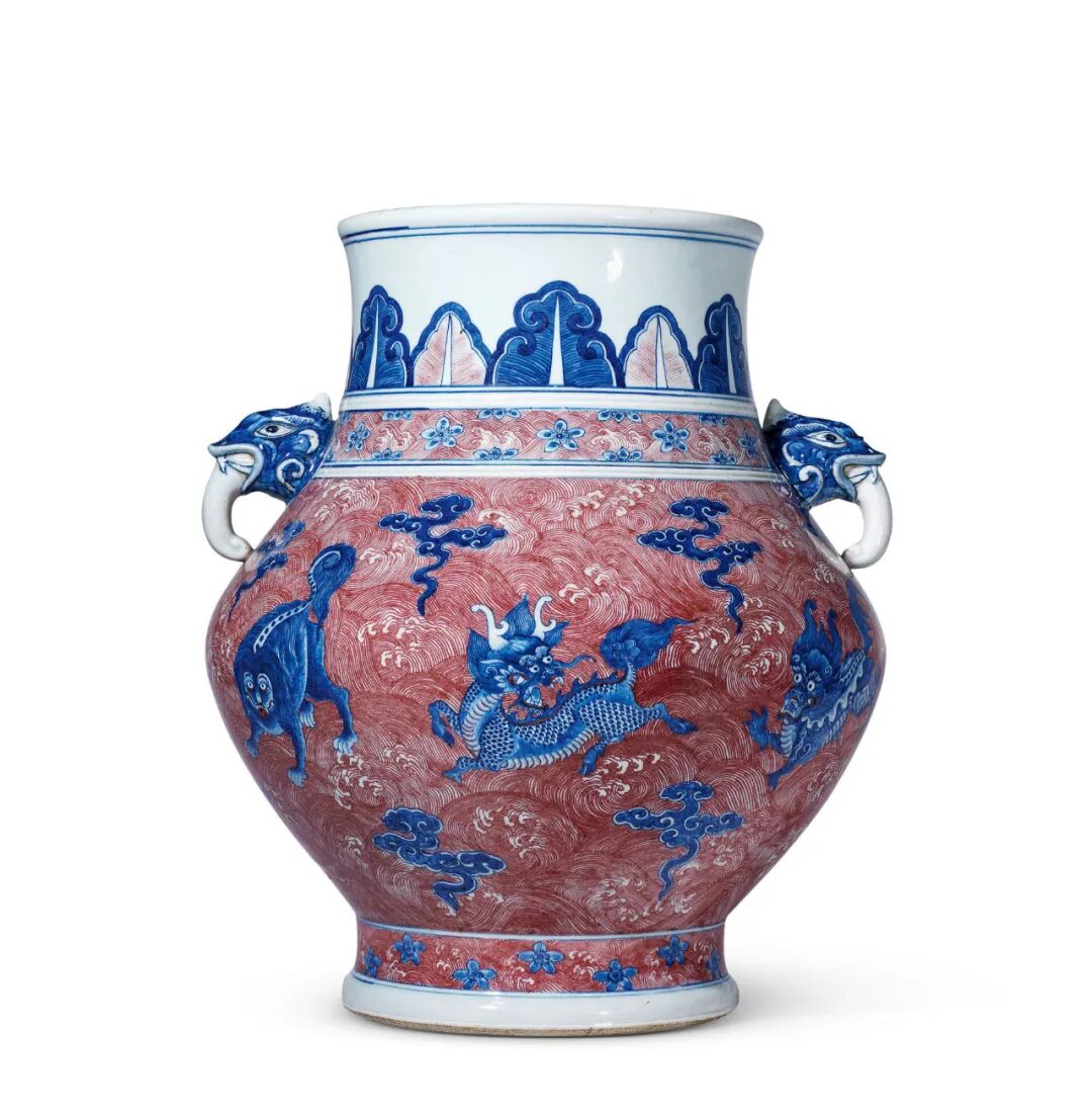备注:佳士得南肯辛顿,2004年6月11日,Lot126拍品估价:800,000 - 1,000,000 人民币本拍品造型借鉴了商周宫廷青铜器样式,以瓷仿铜的具有“礼器”性质的宫廷陈设瓷,瓶式为鸠耳尊。唇口,外侈,溜肩鼓腹,腹下渐收,高圈足,底无釉见旋纹。肩两侧一对青花鼋首做耳,独角上翘,双目炯炯有神,大嘴怒张,口吐长舌,颇具气势。整器施白釉,胎质坚密,釉面润泽光洁。颈部青花弦纹内绘仰莲蕉叶纹及海水梅花纹饰,花卉清雅可人。腹部通体以釉里红满绘海水波涛,汹涌翻腾,细如发丝。海浪中以青花绘六只海中瑞兽飞翔于海波之上,形态各异,有火马,有牛头、虎爪、马尾组成的飞兽,有飞翼鱼身的怪兽,或回首而望,或腾空飞翔。兽头部口、鼻、耳、角及鬃毛均描绘细致,角须威武,身材雄壮,鳞片细密,蹄足支撑有力,尾部鬃毛张扬,十分生动,灵气尽显,有呼之欲出之感。间以朵朵青花祥云为饰,仙气氤氲。整器挺拔端正,画工精湛,巧妙将瑞兽之体量感及鬃毛的质感表现而出,颜色绚丽,青花浓郁,铜红鲜艳,相映成趣,层次鲜明。拍品青花发色艳丽,釉里红线条明快而不晕散,实乃乾隆时期不为多见,烧制工艺极难掌握,工序繁复,传世成品数量稀少,弥足珍稀。