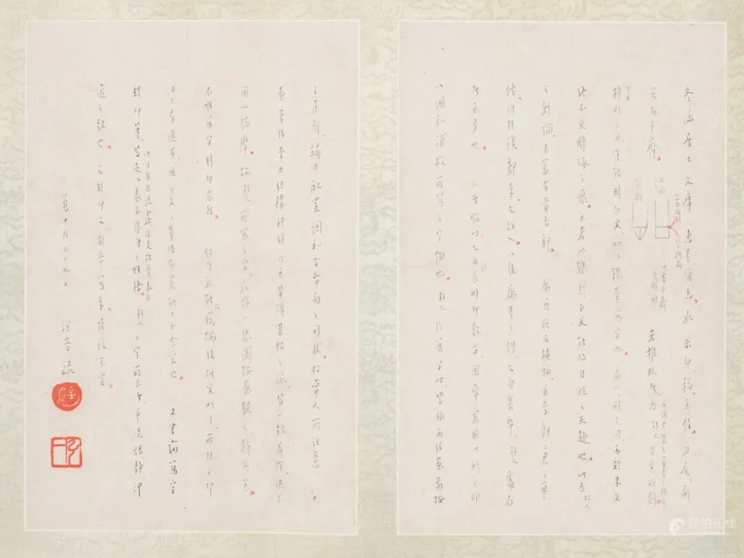 题识:冬涵居士文席:惠书诵悉,承示印稿,至佳。刀尾扁尖而平齐,若椎状者,为朽人自意所创。椎形之刀,仅能刻白文,如以铁笔写字也。扁尖形之刀,可刻朱文,终不免雕琢之痕,不若以椎刻白文,能得自然之天趣也。此为朽人之创论,未审有当否耶?属写联及横幅,并李、郑二君之单条,附挂号邮奉,乞收入。以后属书之件,乞勿寄纸,朽人处存者至多也。仁者暇时,乞为刻长方印数方,因常需用此形之印以调和补救所写之字幅也。朽人写字时,皆依西洋画图按之原则,竭力配置调和全纸面之形状,于常人所注意之字画、笔法、笔力、结构、神韵乃至某碑某帖之派,皆一致屏除,决不用心揣摩,故朽人所写之字,应作一张图按(案)画观之,斯可矣。不唯写字,刻印亦然。仁者若能于图按法研究明了,所刻之印必大有进步,因印文之章法布置能十分合宜也。又无论写字刻印等,皆足以表示作者之性格(此乃自然流露,非是故意表示),朽人之字所示者,平淡、恬静、冲逸之致也。乞刻印文,别纸写奉,谨复不宣。旧十月二十九日,演音疏。1.《弘一法师》图版62,文物出版社,1984年10月。2.《弘一大师遗墨》,第212-213页,华夏出版社,1987年。3.《弘一大师李叔同篆刻集》卷一,第100-101页,天津人民美术出版社,2009年4月。5.《弘一大师全集——第八册》,第582-583页,福建人民出版社,2010年10月。1.《弘一大师李叔同书信集》,第62页,陕西人民出版社,1991年7月。2.《弘一大师文集——书信卷(二)》,第276、277页,内蒙古人民出版社,1996年9月第一版。3.《弘一法师书信》,第254页,生活读书新知三联书店,2007年11月。4.《弘一法师书信全集》,第476页,陈飞鹏整理,北京:文物出版社,2017年10月。拍品估价:800,000 - 1,200,000 人民币