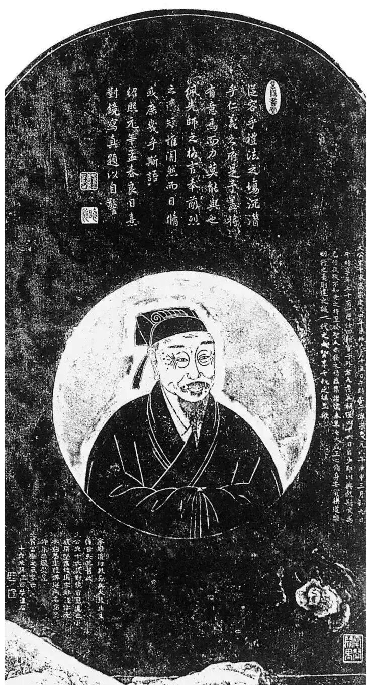 这幅自画像取自建瓯朱熹“对镜写真”石刻拓本(图7),据《福建史志》记载,建瓯是朱熹的故里,朱熹7岁随父母迁居建瓯,在那里生活了9年,晚年留下遗嘱让嫡子嫡孙回到建瓯建家庙祭祖,之后大部分朱氏后裔在建瓯繁衍生息。