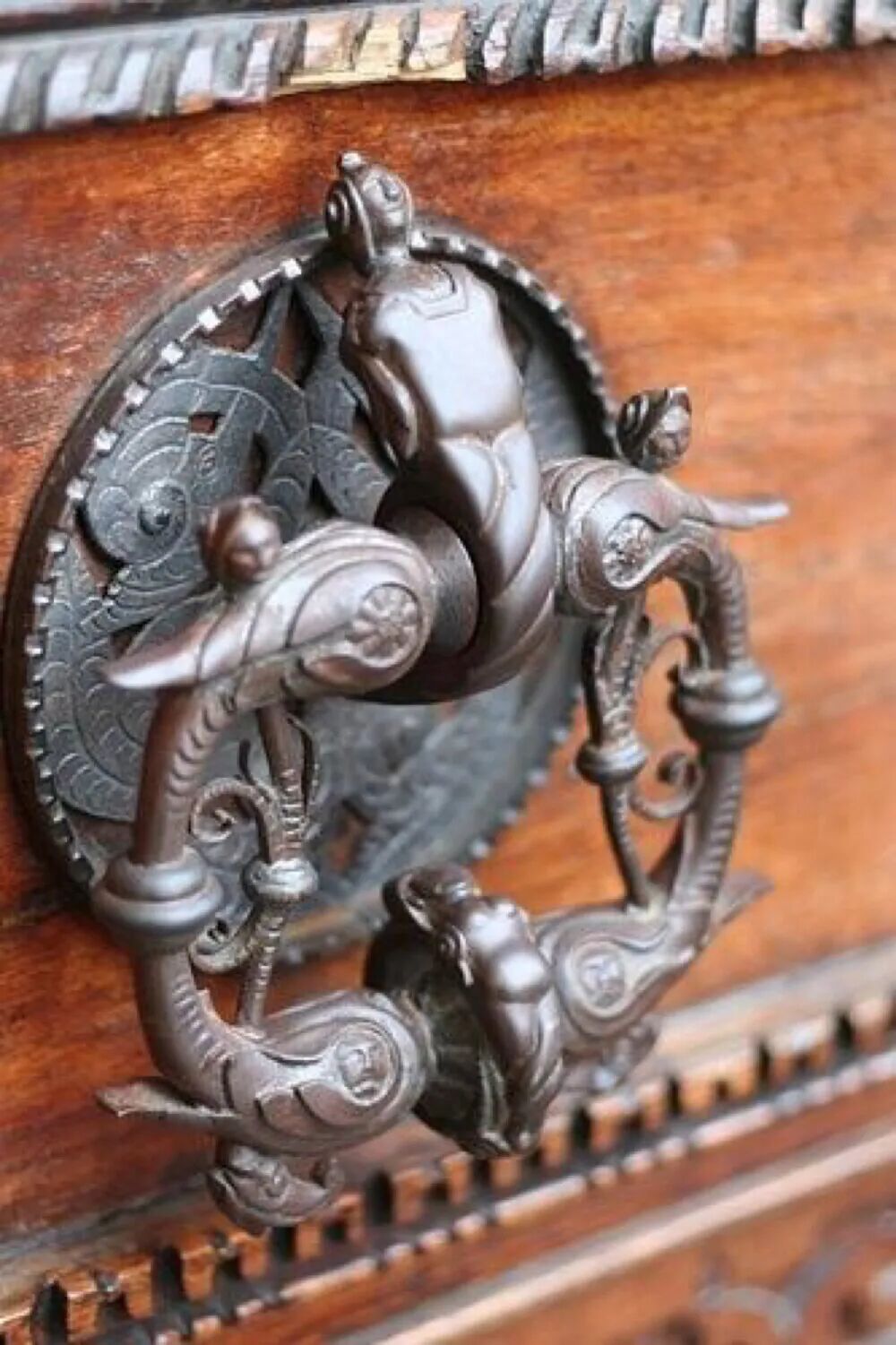 而门环的下半部,则多打制成扁平状,上面再錾出飞龙腾云驾雾的图案,十分精美,更突显出皇家的高贵风范。