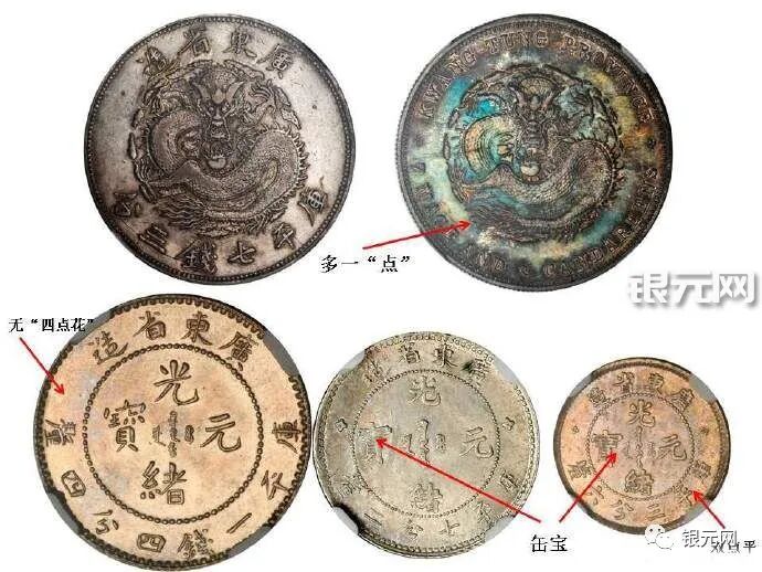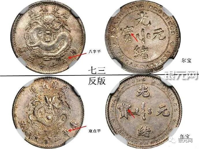 “七二反版”龙面,除了二角面值(即“一钱四分四厘“)银币外,其他面值的银币皆添加了四点花,用以分隔龙上方的”广东省造“和下方的“库平X钱(分)X分(厘)”。这一改变也一直保留到了最终的“七二正版”上。“银元网”公众号。之所以二角的龙面没有添加四点花,其原因可能是因为二角面值所标的“库平一钱四分四厘”字数较多,而银币又较小,故而怕添加四点花反而使币面有拥挤之嫌。
