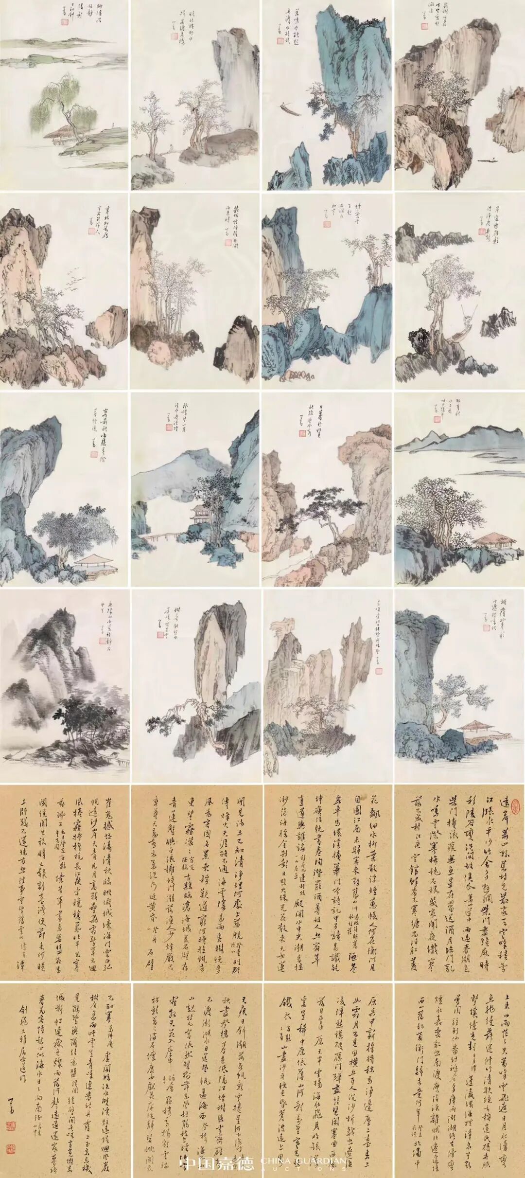 这套诗画册一共二十四页,每页仅半尺见方,是坊间最爱的溥氏“小画”。画有十六页,都画在绢上,一页纯水墨,其余十五页均为设色浅绛的小青绿山水,每页上均有溥儒行书题写的自作五言诗句;写在金笺上的书法有八页,五言诗十一首,七言诗九首,计廿首。
