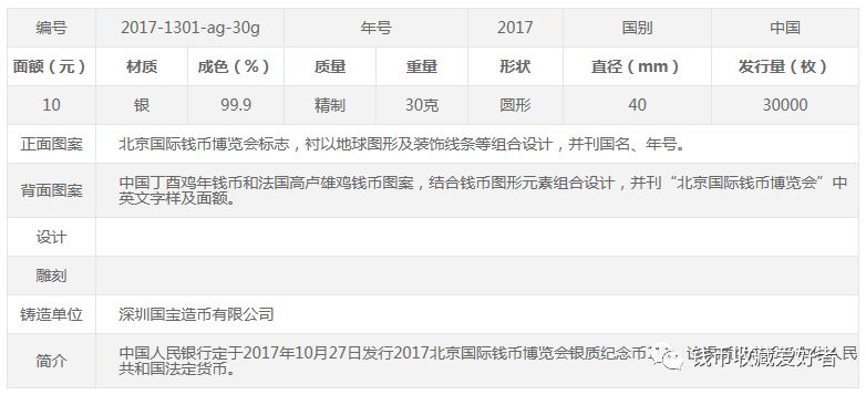 二、纪念币规格和发行量。该银质纪念币为精制币,含纯银30克,直径40毫米,面额10元,成色99.9%,最大发行量30000枚。