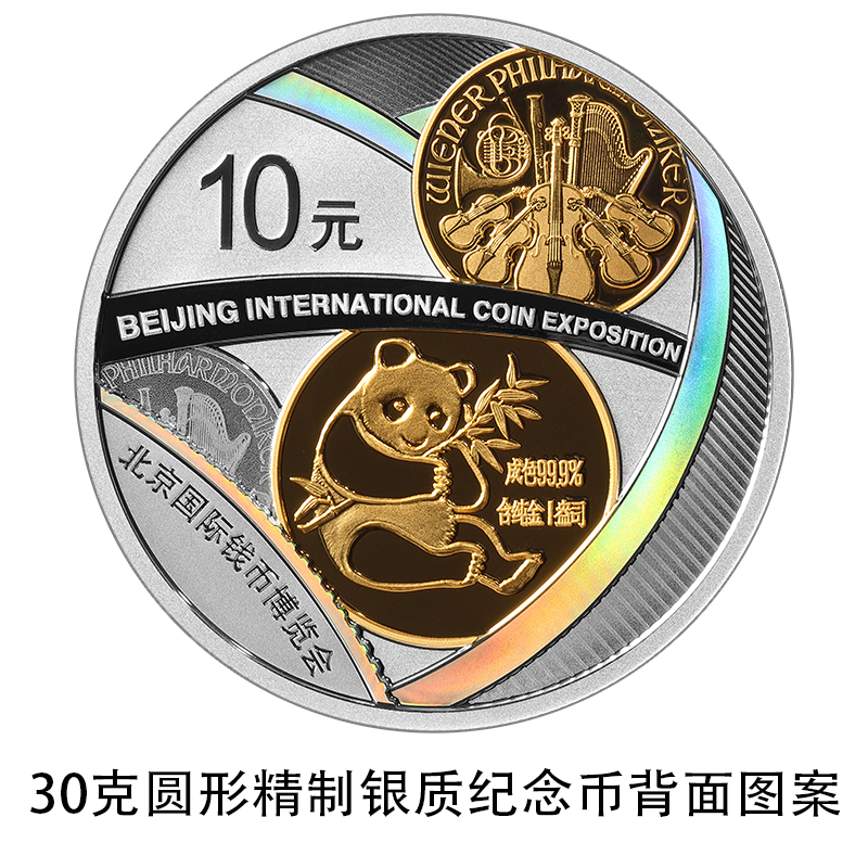 (二)背面图案。该银质纪念币背面图案为中国熊猫金币图案和奥地利维也纳爱乐乐团金币图案,结合钱币图形元素组合设计,并刊“北京国际钱币博览会”中文字样、“BEIJING INTERNATIONAL COIN EXPOSITION”英文字样及面额。