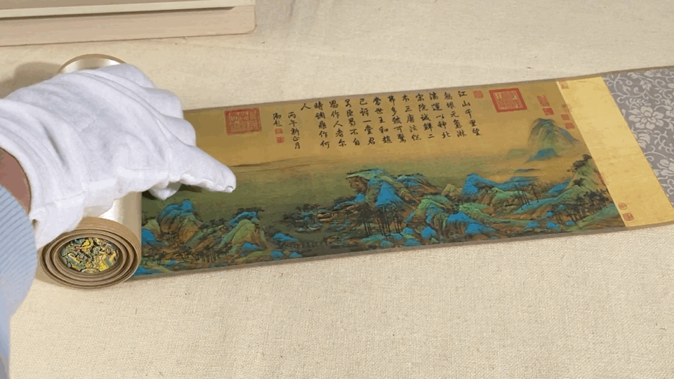 《千里江山图》上引首、历代名家题记、收藏印玺等浓重文化痕迹众多,展现了中国艺术瑰宝的绝妙魅力。