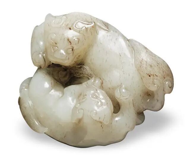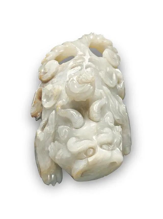 在工艺方面,明清时期,玉雕动物常用阴刻、镂空、圆雕、打磨、浮雕等工艺,其中清代玉雕工艺主要特点是在器物镂空处打磨光滑,不留镂空痕迹。器体周身注重肌肉力量感的雕刻,整体打磨光滑圆润。此时期动物常与花卉、瑞草、祥云为伴,整体器物趋于图案化。在玉器用料上,常用白玉、青玉等玉料,常利用玉石本身皮色进行。