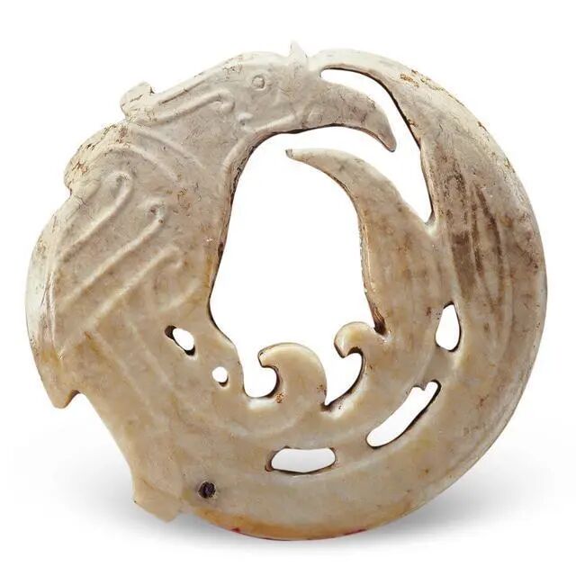 此玉佩呈团凤状,镂空雕刻,首尾相连。凤首有勾形长冠,圆眼,去地浅浮雕简单刻画出双翼,尾部分为成双叉,好似即将展翅飞翔。石家河文化玉雕动物纹整体刻画简单抽象,同时也代表了新石器时期动物题材玉器的较高水平。