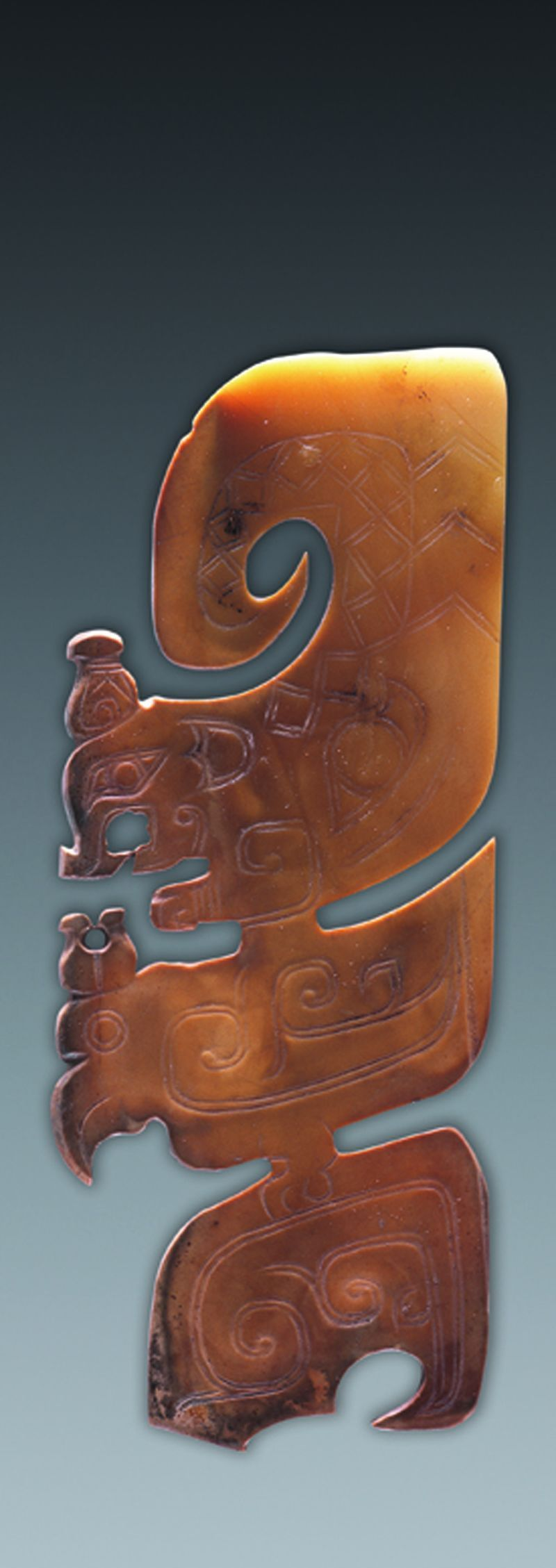 玉质呈黄褐色,片状雕刻,两面纹饰相同。器型为一凤鸟背负一龙,凤爪抓踩勾云状云纹。最上面的龙形为:龙身向上竖起,尾端呈卷曲状,头上一角竖起,臣字形大眼,张口露齿,身下一足平放于头下,足双爪。龙身及尾部双阴线刻饰重回纹、雷纹和鳞纹,胸腹部刻细弯眉和眼目纹。凤鸟作踩云站立状,头立双角,圆形双圈大眼,尖喙,尾短较尖,身下一足,足四爪,鸟身双阴线雕翎纹,凤鸟爪下踩勾云状云纹,其上双阴线刻云纹图案。
