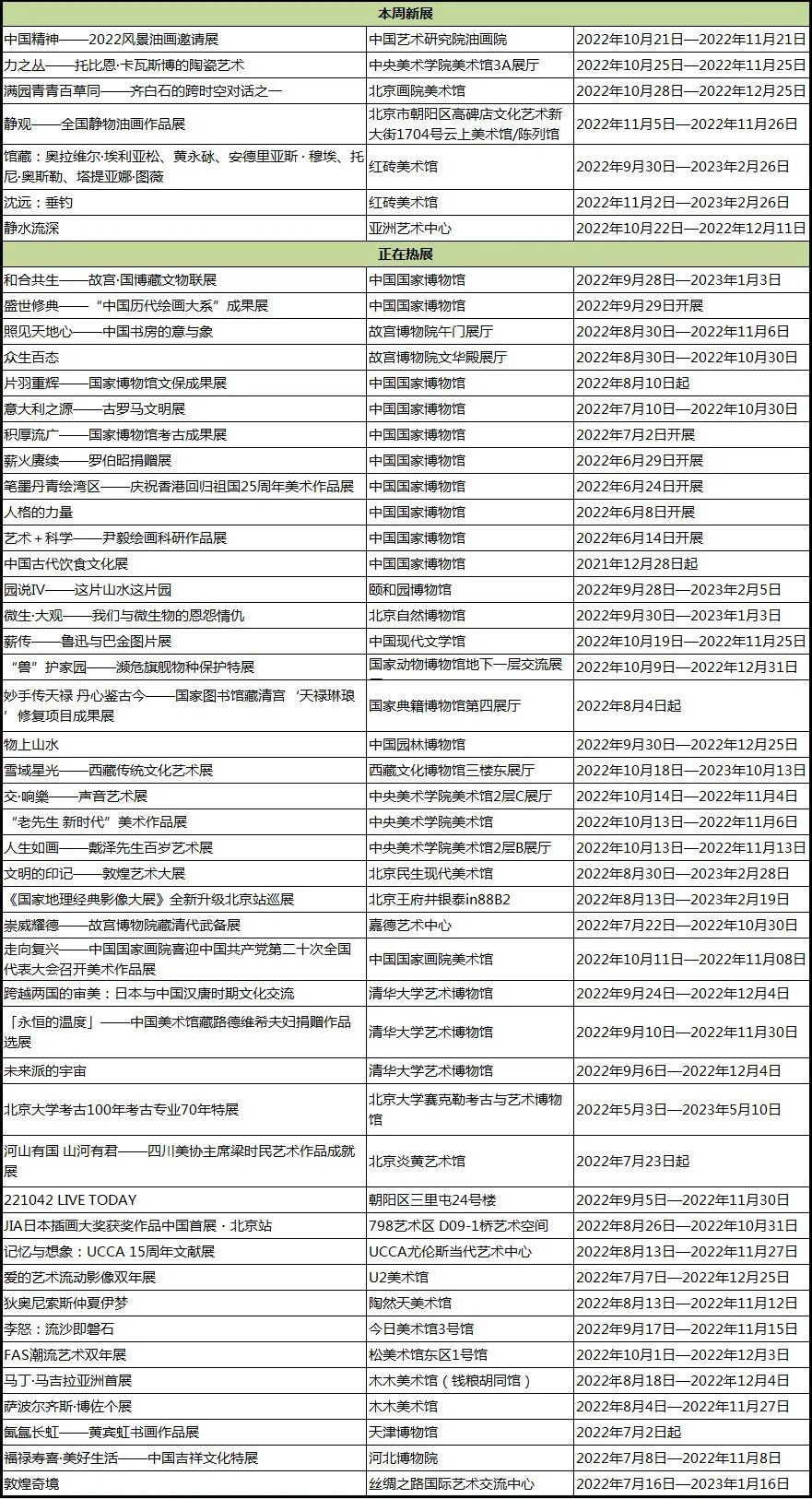 展览时间:2022年10月13日—2022年11月13日展览时间:2022年8月30日—2023年2月28日“国家地理经典影像大展”本次展览在以往的基础上进行全面升级,由7大主题板块升级为八大主题板块,分别涵盖探索发现、大地之美、奥妙生命、勇闯未知、全新视界、环保之声、《国家地理》的摄影记者们及巍巍华夏。通过探索、秘境、自然、人文、科技视野理解杂志百年坚持的追求,此次新增40副全新作品,多幅获奖作品首次亮相中国,囊括人类、动植物、建筑、自然等多样化的拍摄素材,带你领略从未见过的斑斓奇景;同时,特别策划关于中国的展区——巍巍华夏,发现960万平方公里土地之壮阔山河,体验中华泱泱大国之千年文明。展览时间:2022年8月13日—2023年2月19日本次“崇威耀德——故宫博物院藏清代武备展”,甄选故宫珍藏武备文物一百五十余件(套),以清代御制藏品为主体,按照武备文物在清代的功能,以“礼遇天地”“神锋握胜”“宝冶凝涛”三个单元予以呈现。展览时间:2022年7月22日—2022年10月30日展览地点:嘉德艺术中心一层展厅(北京市东城区王府井大街1号)走向复兴——中国国家画院喜迎中国共产党第二十次全国代表大会召开美术作品展