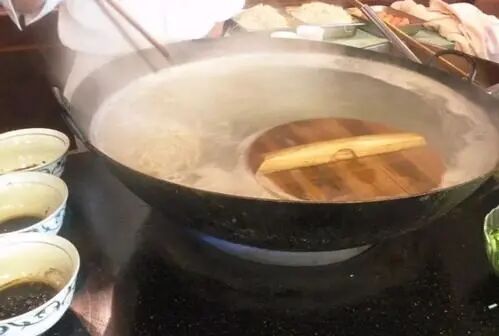 锅盖面用的面条是“跳面”。所谓“跳面”,就是把和揉成的面放在案板上,由操作人员坐在竹杠一端,另一端固定在案板上,既上下颠跳,又似舞蹈,似杂技,反复挤压成薄薄的面皮,再用刀切细而成,这样“跳”出来的面条柔韧性特好。