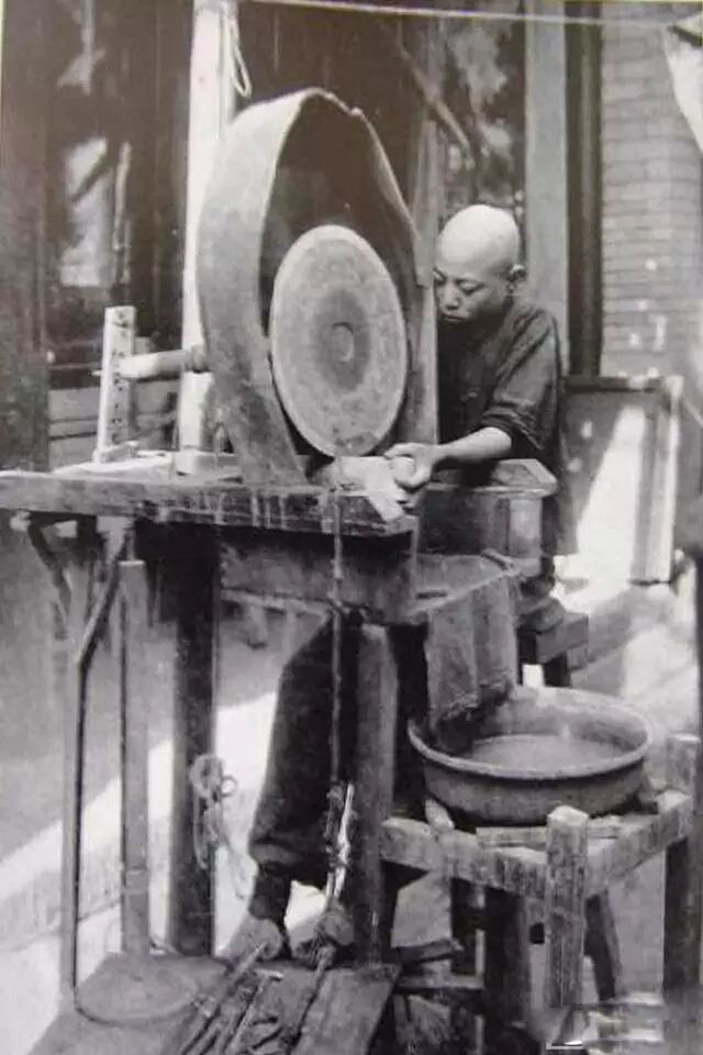 脚上踩着伐,砂轮才会运动。这么大的砂轮,做一件小件,那是该有多不容易啊。