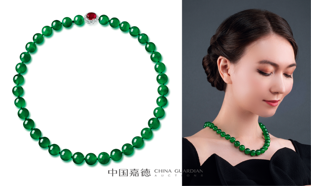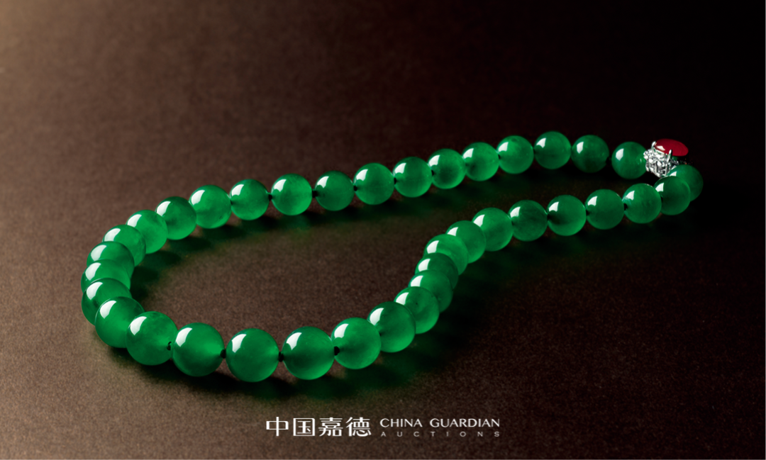 本季中国嘉德荣幸的带来Lot5588,一条极为珍罕的旷世绝色的天然翡翠珠链。这条珠链的翡翠珠子属典型的老坑种翡翠品质,由于经历过流水、风沙等大自然的深度洗礼,质地倾向于细腻,完整,温润中富有刚强的质感。三十七颗珠子大小均匀,直径最大一颗达13.70毫米,其玉质温润清透,色泽浓郁均匀,水色双满,瑕疵甚微,不见色根,珠子与珠子之间无论在透明度、尺寸、颜色皆为上乘匹配,可谓万中无一,即使在拍卖也很难找到第二条能够媲美。