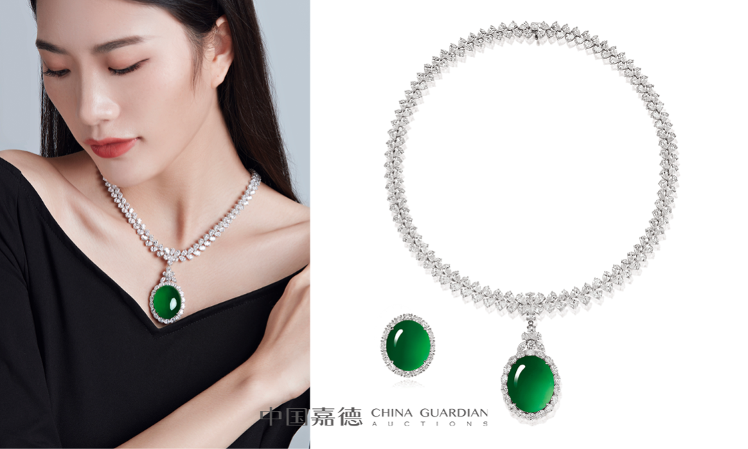 项链配镶华贵璀璨的臻美钻石,工艺精湛用料考究。吊坠可以与项链自由拆换,搭配其他项链。这套翡翠珍罕难寻,实属收藏典范。